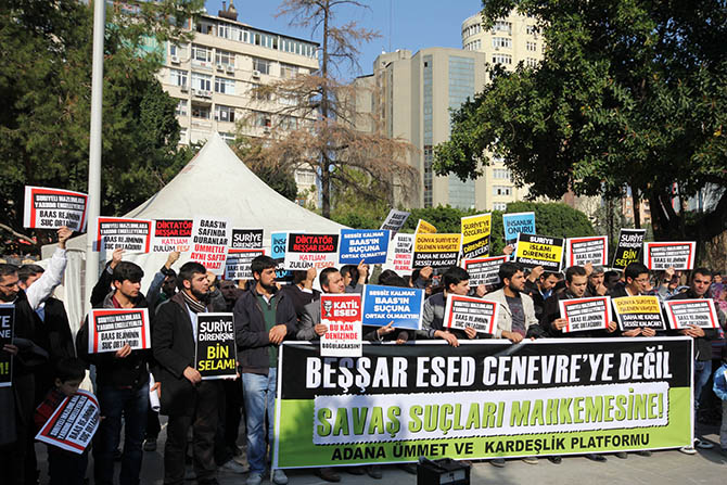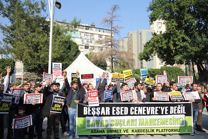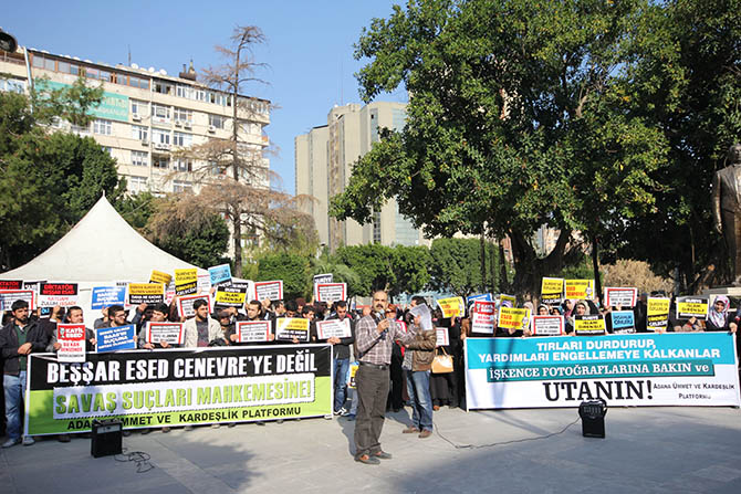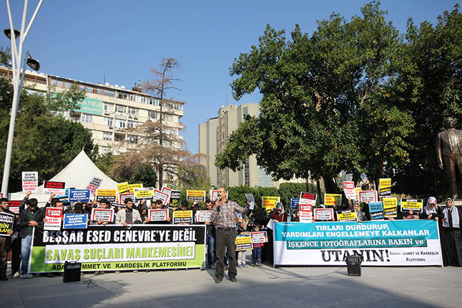Özgür-Der’in de aralarında bulunduğu Ümmet ve kardeşlik Platformunun çağrısıyla duyarlı Müslümanlar öğle namazından sonra Adana merkez İnönü Parkında toplandılar. Hakan Yalınız’ın sunumunu yaptığı,Erhan Atıcı’nın basın açıklamasını okuduğu eylemde “Tırları Durdurup Yardımları Engellemeye Çalışanlar, İşkence Fotoğraflarına Bakın ve Utanın!”, “Beşer Esed Cenevre’ye değil, Savaş Suçları Mahkemesine!” yazılı pankartlar açılırken “İnsanlık Onuru Suriyede Ölmesin!”, “Baas Canavarını Durdurun!”, “Suriye İslami Direnişle Özgürleşecek”, “Suriye’ye Özgürlük Direnişle Gelecek!”, “Sessiz Kalmak Baas Suçuna Ortak Olmaktır”, “Katil Esad Bu Kan Denizinde Boğulacaksın!” yazılı dövizler taşındı.
