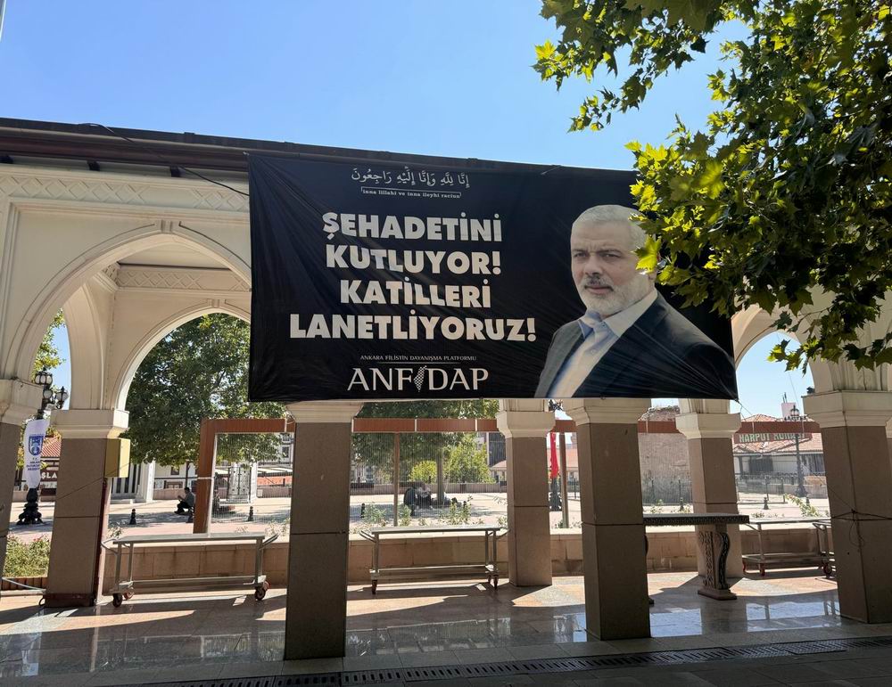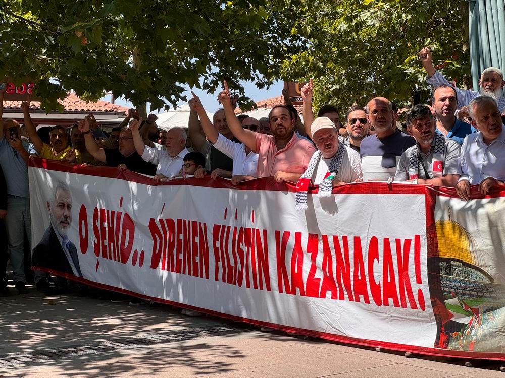Ankara Filistin Dayanışma Platformuna mensup İslami kuruluşların çağrısıyla Hacı Bayram Veli Camisi’nin avlusunda toplanan binlerce kişi, “Şehit Heniyye yolun yolumuz”, “Şehitlerin yolunu sürdüreceğiz” sloganlarını attı.