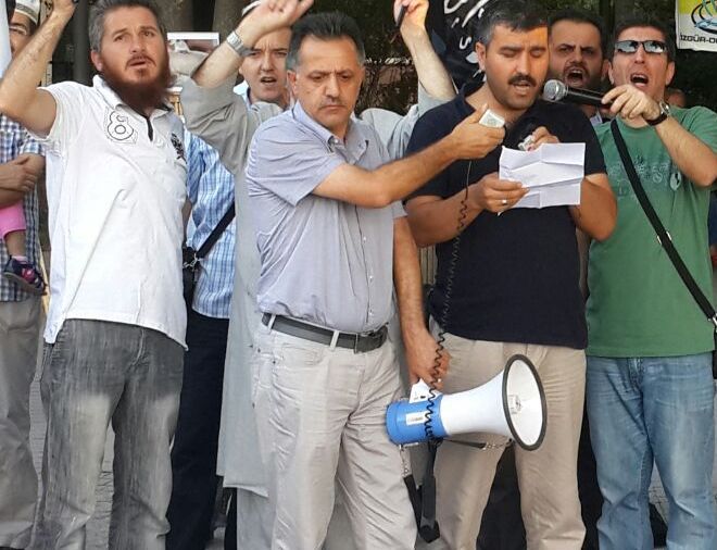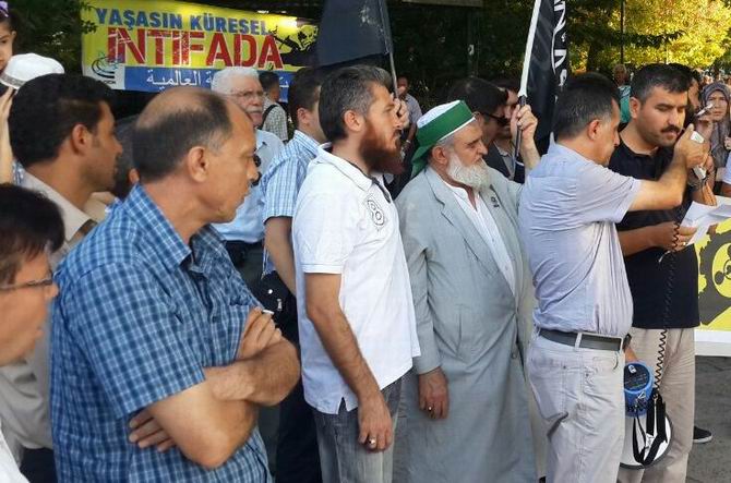 “Katil Esed Suriye’den Defol”, “Kahrolsun işbirlikçi hainler”, “Yaşasın Gazze Direnişimiz”, “Muhacire Ensarız katillere düşmanız”, “Lailahaillallah ABD lanetullah.” Sloganlarının atıldığı basın açıklamasında; “Suriye, Kudüs, Mısır Direniyor Şehidler yolumuzu Aydınlatıyor., “Dün Hama Bugün Humus Katliam Sürüyor Suriye Halkı Direniyor.” Pankartları açıldı.