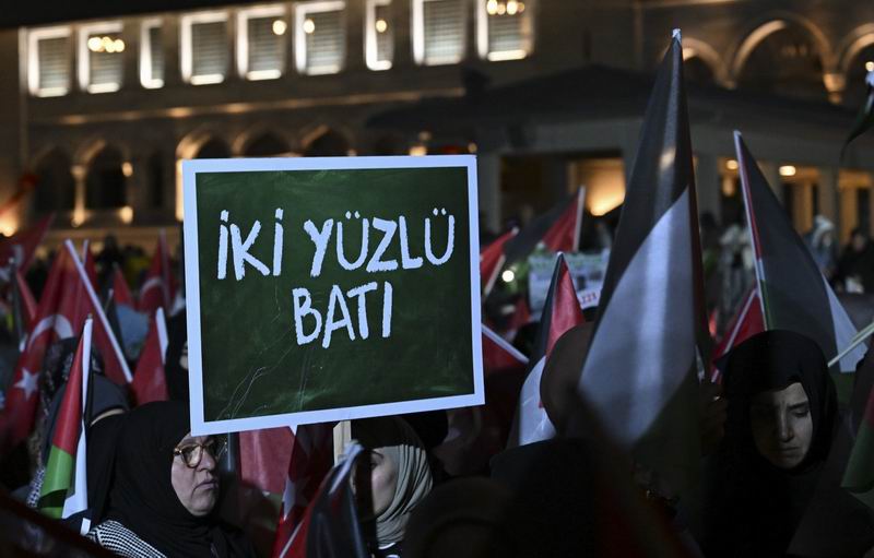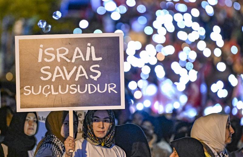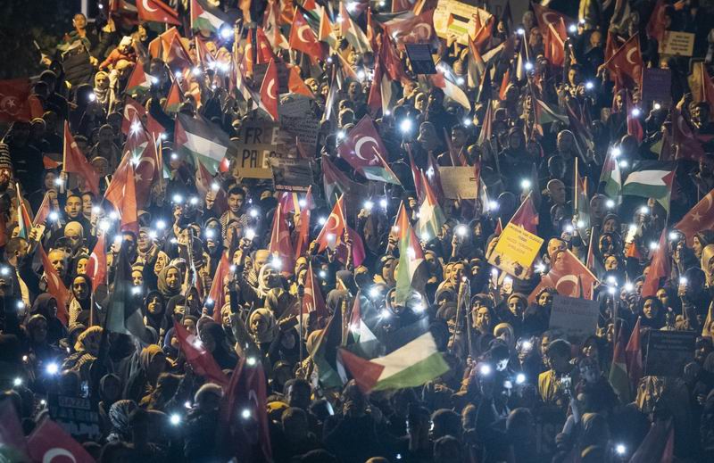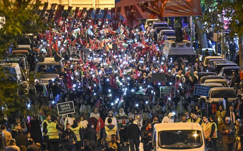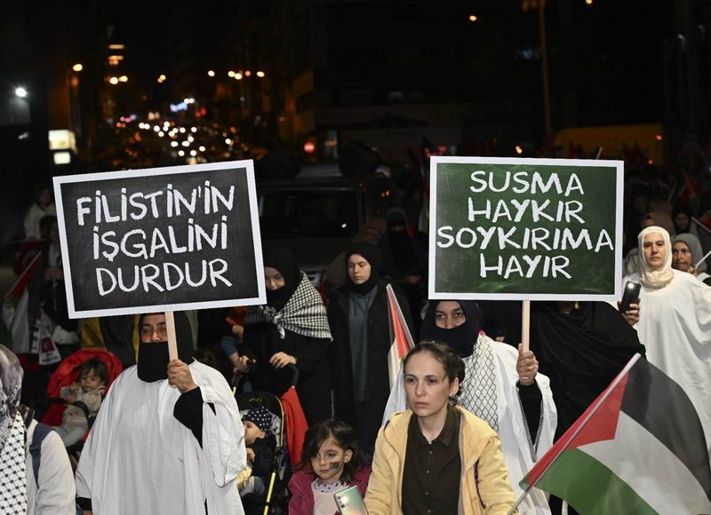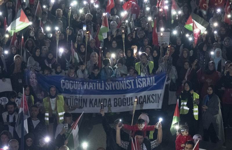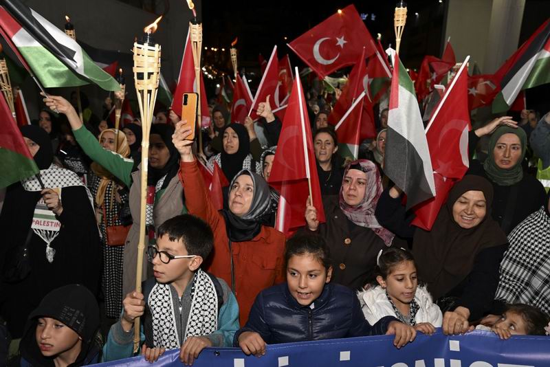 Kocatepe Camisinde toplanan yüzlerce aile, “Gazze’ye destek katil İsrail’e lanet” içerikli sloganlar atarak meşaleler ve telefon ışıklarıyla Sıhhiye Meydanına kadar yürüdü.