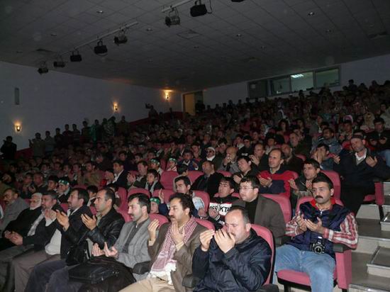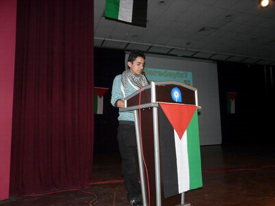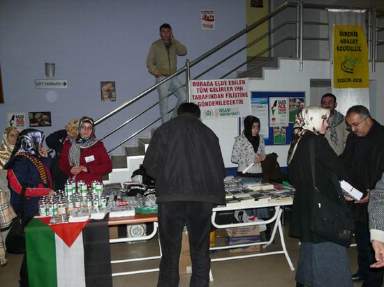 Sık sık sloganların atıldığı salon "tekbir" ve "kahrolsun İsrail" sesleri ile inledi. Salonun girişinde, geliri Filistin'e gönderilmek üzere kitap, Filistin bayrağı, poşu, atkı satılarak bağış yapıldı.