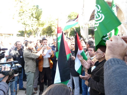 Polisin oyalama ve engelleme çabalarına rağmen yoğun bir kalabalık vardı. Atılan sloganlardan bir kısmı ise: "Hamas'a Selam Direnişe Devam", "Kahrolsun Siyonizm Kahrolsun İsrail", "Yaşasın Küresel İntifada" "Hepimiz Filistinliyiz, Hepimiz Hamasız".