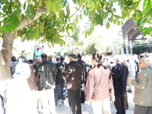 Bunun farkına varan göstericiler polisin engellemelerini dinlemeyerek gösteriye başladılar. Güvenlik güçlerinin engelleme çabalarına rağmen gıyabi cenaze namazı kılınıp İsrail kınandı ve aleyhinde sloganlar atıldı. Daha sonra grup, Şeyh Ahmet El-Acemi'nin Kabe'de okuduğu Gazze dua'sını okudu.