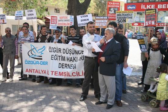 Özgür-Der Antalya Temsilciliği olarak, toplumsal hayatı felce uğratıp, toplumu ağır baskılar altında sınıflar bölüp köleliğe icbar eden, siyasal ve ekonomik eşitsizliği sürekli kılmak ve bir avuç azınlığın saltanatının devamı amacını güden hukuksuzlukların bir an önce giderilmesi için HERKES İÇİN ÖZGÜRLÜK, HERKES İÇİN ADALET! şiarını bir kez daha toplumsal sorumluluğumuz gereği yineliyoruz.