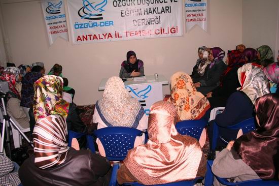 Özgür-Der Antalya temsilcilik binasında gerçekleştirilen konferans sunuş konuşmasıyla başladı. Daha sonra Hülya ŞEKERCİ konuşmasında şu konulara değindi: vahiy Arap cahiliye toplumuna indiğinde birçok konuya müdahale ettiği gibi kadın konusuna da müdahale etmiştir. Çoklukla övünmek; çok mal ve çok çocukla özellikle erkek çocukla övünmek cahiliyenin temel karakteriydi. Vahiy öncesi kadının durumu tamamen feodal bir yapı üzerine kurulmuştu. Cahiliyede kız çocuğu doğurmak ve kız evlat sahibi olmak ayıptı ve aşağılık bir durum olarak kabul edilirdi. Bu konuyu Kur'an bize şöyle hatırlatıyor;