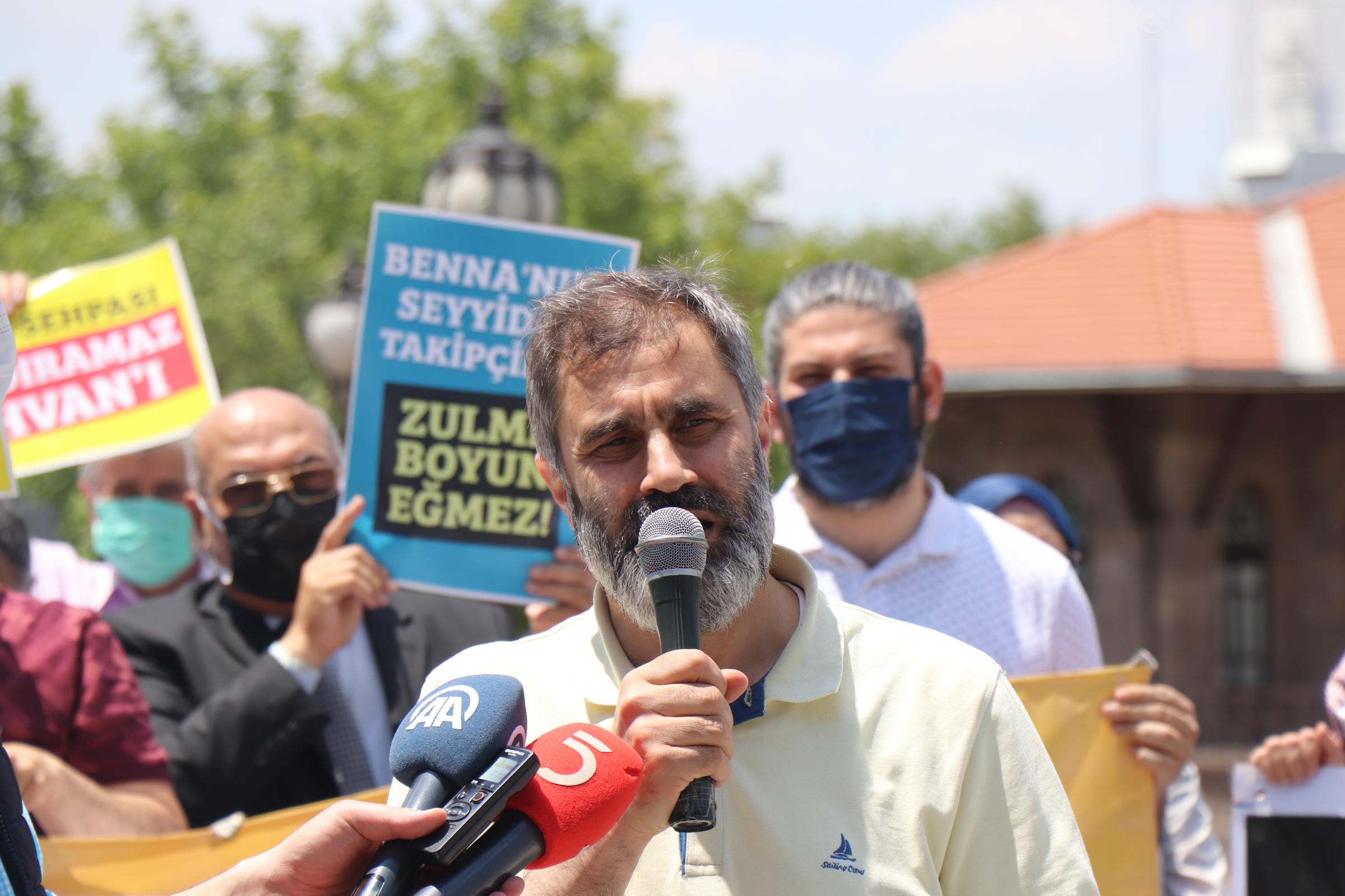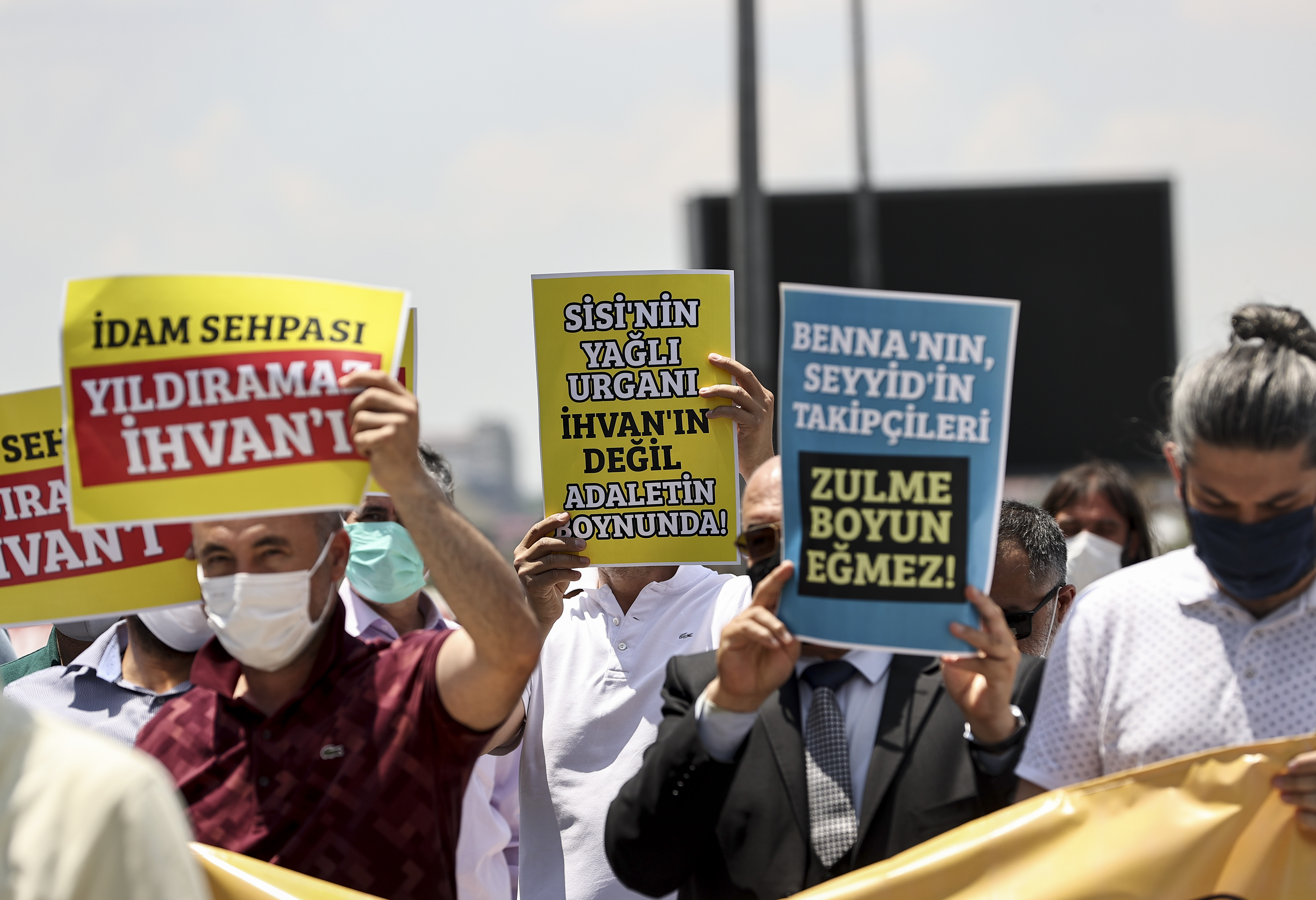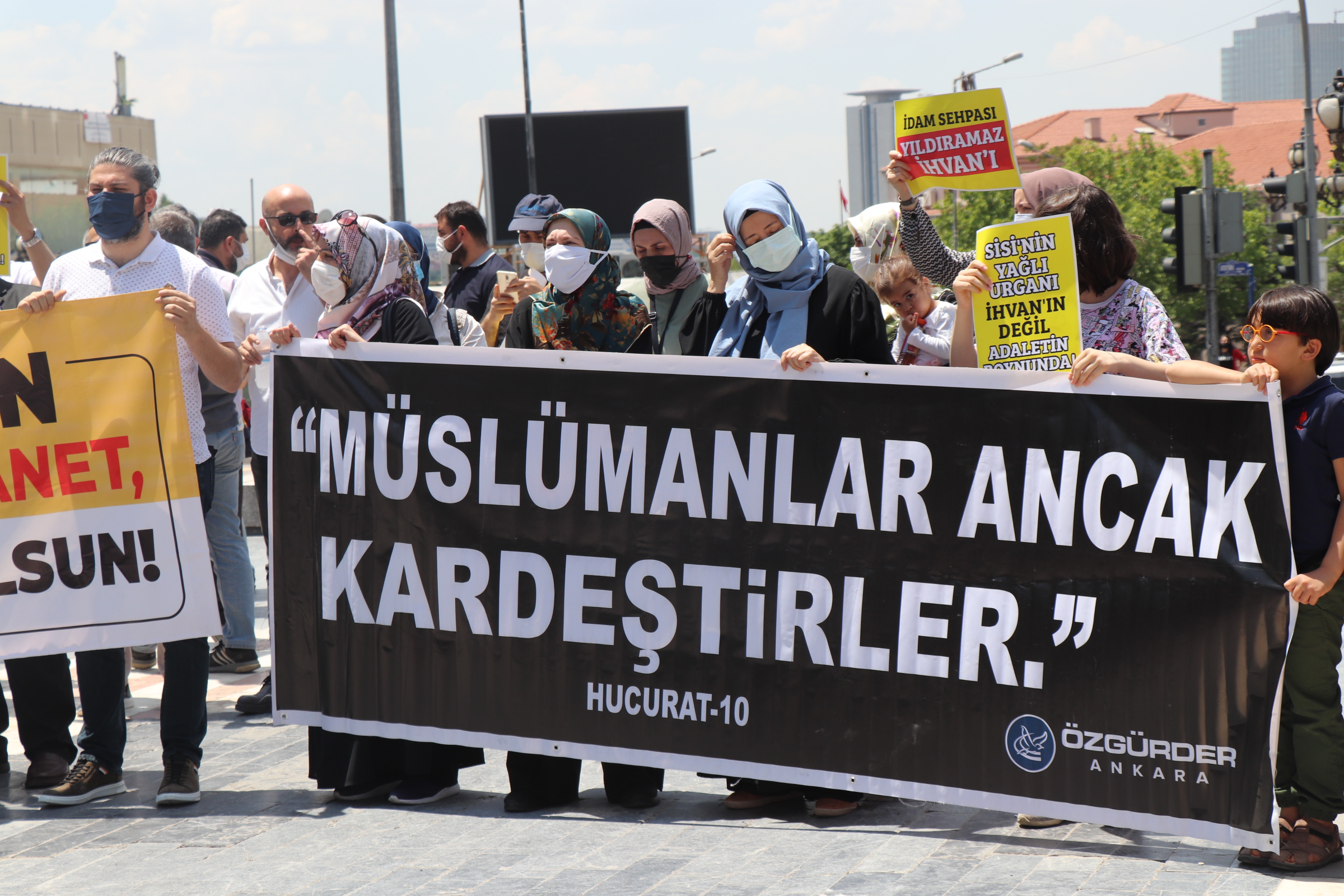 Ulus Meydanı'nda bir araya gelen grup üyeleri, "Sisi Cuntasının İdam Kararlarına Lanet, İhvan'a Bin Selam Olsun" ve Kur'an-ı Kerim'deki Hucurat Suresi'nde yer alan "Müslümanlar Ancak Kardeştirler" ayetinin yazılı olduğu pankartları açtı.