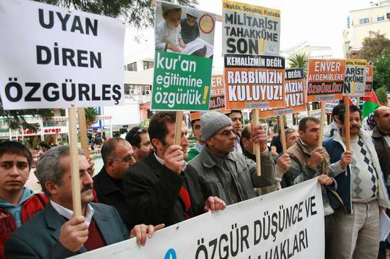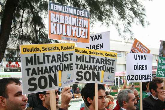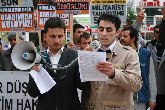 Basın açıklamasına katılanlar "Enver Aydemir'e Özgürlük", "Okulda, Sokakta Kışlada Militarist Tahakküme Son", "Kemalizmin Değil Rabbimizin Kuluyuz" yazılı dövizleri taşıdılar.