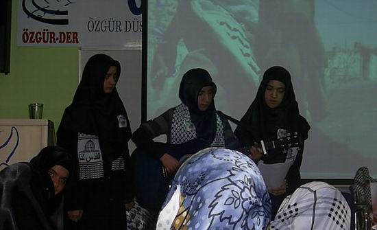 Özgür-Der Batman Şubesi'nde yapılan ve sunuculuğunu Sena Parlar'ın yaptığı program, Semra Doğru ve Şüheda Çevik tarafından okunan Kur'an-ı Kerim ve mealiyle başladı. Ardından Filistin'de yaşananları anlatan slayt gösterimi yapıldı. Filistin'in yaşadığı tarihsel süreçler Beyza Sevim, Esma Yıldız ve Betül Gayretli tarafından anlatıldı.