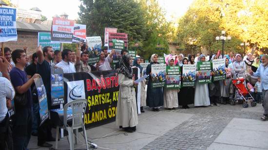 Saat 18.00'de Orhangazi parkında bir araya gelen Bursalı müslümanlar başörtüsü yasağının hukuksuzluğunu dile getirerek, yasağın bir an evvel kalkması ve başörtüsünün her alanda serbest kalması gerektiğini bir kez daha ifade etti. Özgür-Der adına basın açıklamasını okuyan Sara IŞIKLAR özetle şunları kaydetti:
