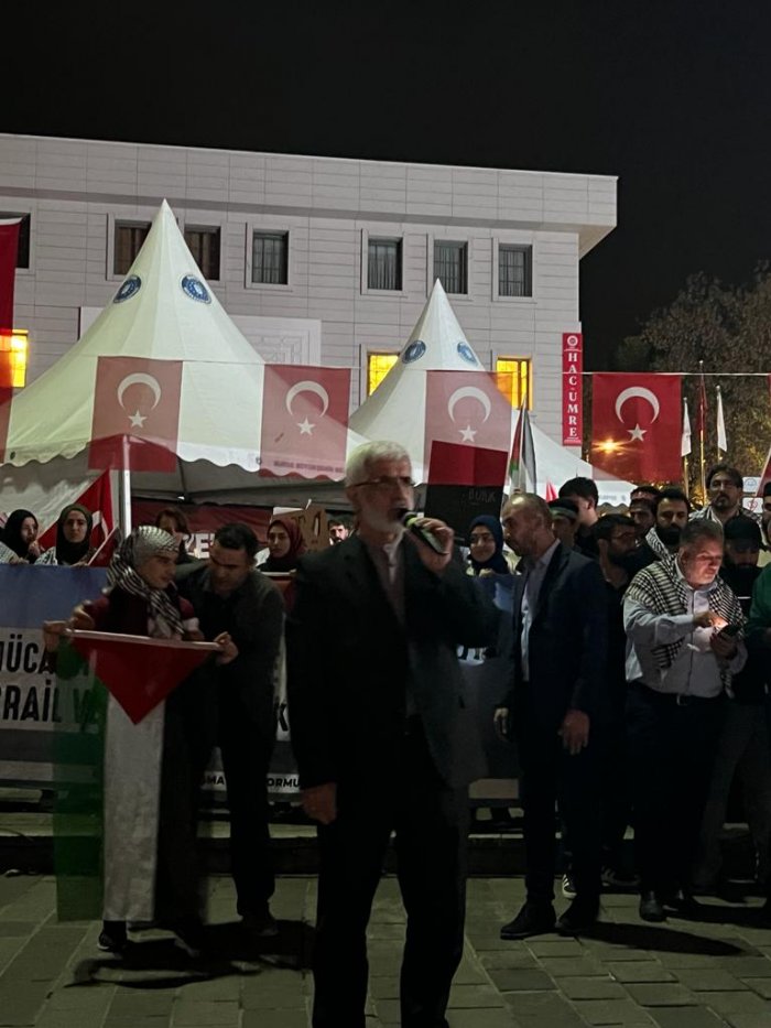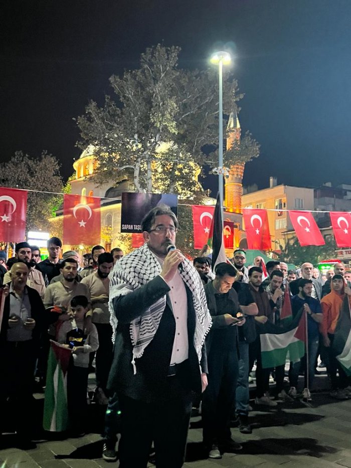 Şehreküstü Meydanı’nda bir araya gelen Müslümanlar Aksa Tufanı için basın açıklaması düzenledi. Program İpekyolu Uluslararası Öğrenci Derneği Başkanı Bursa İHH yönetiminden Ebubekir Armağan konuşmalarıyla başladı. Kısaca; Filistin’de bugün onurlu bir mücadele verildiğini ve bunun tüm Müslümanlar için bir şeref ve haysiyet olduğunu dillendirdi. Bu mücadelede İsrail terör devletinin zelil bir şekilde boğulacağını söyledi. Daha sonra İHH’nın Cuma günü tüm Türkiye’de bir konvoy oluşturarak, Adana İncirlik Üssü’ne doğru gidileceğini hatırlatma yaparak konuşmalarına son verdi.