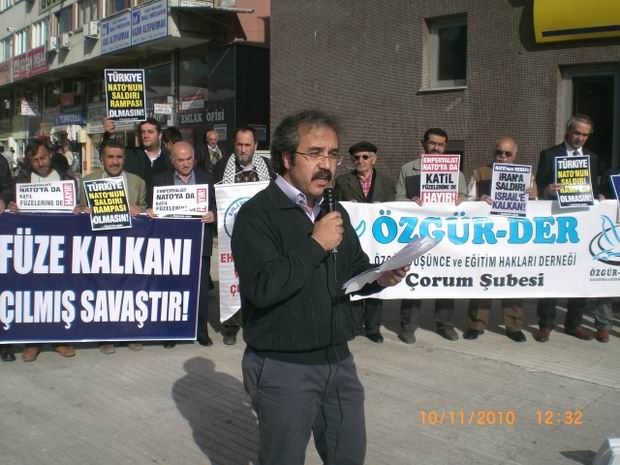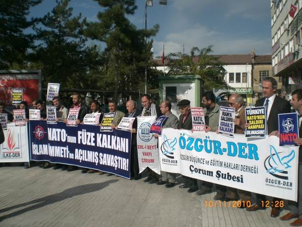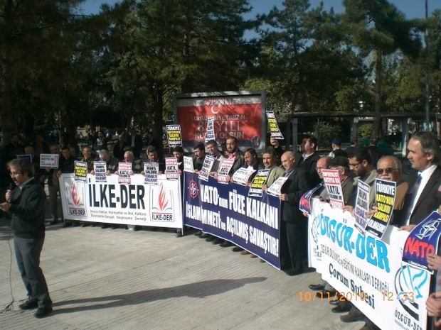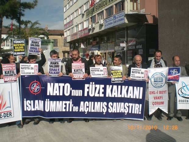 Özgür-Der Çorum Şubesi, İlke-Der ve Çorum Ehl-i Beyt Vakfı NATO’nun Türkiye’ye kurulmasını istediği Füze Kalkan Projesini Çorum Merkez PTT önünden bir basın açıklaması ile protesto ettiler.