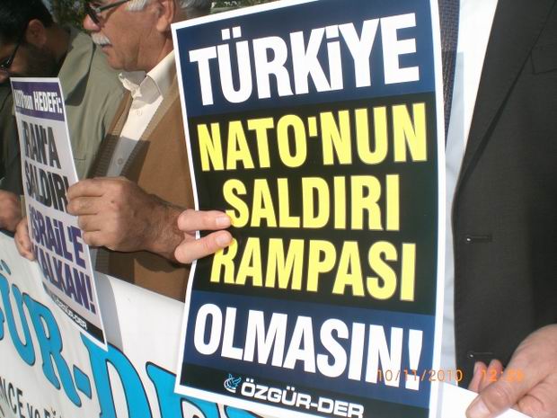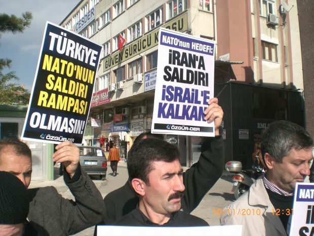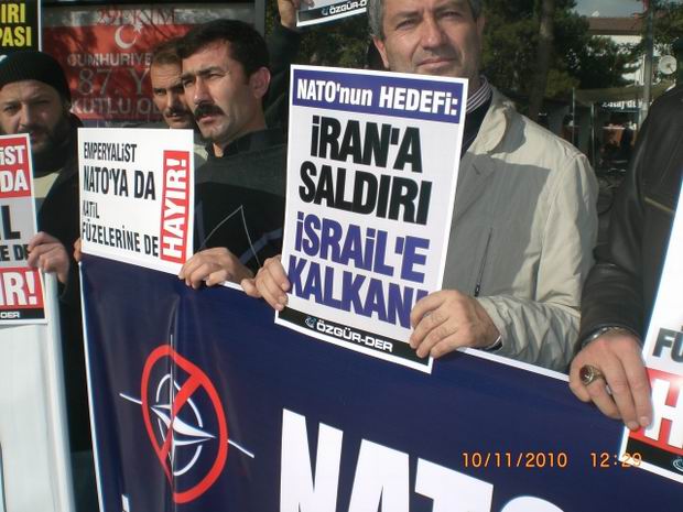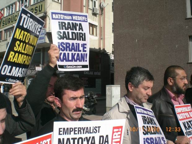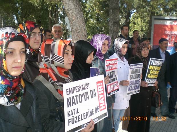 "NATO'nun Füze Kalkanı, İslam Ümmetine Açılmış Savaştır!" pankartı açan Müslümanlar, basın açıklaması süresince " Emperyalist Nato'ya da, Katil Füzelerine de Hayır", " Türkiye Nato'nun Saldırı Rampası Olmasın"," İran'a Saldırı, İsrail'e Kalkan " dövizleri taşıdılar ve " Kahrolsun Emperyalist Zalimler" sloganı attılar…