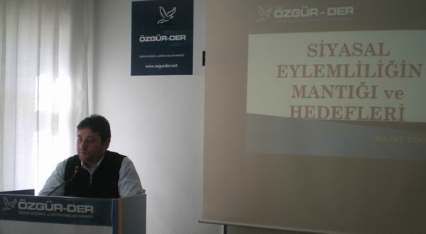 "Siyasal Eylemliliğin Mantığı ve Hedefleri" konulu bir seminer sunan Özgür-Der Çorum Şubesi Başkanı Bülent Gökgöz, konuşmasına, Çorum'da kimi kuruluş ve duyarlı insanlarla birlikte gerçekleştirdikleri eylemliliklerin temel mantığının ve nelerin hedeflenmesi gerektiğinin sağlıklı bir şekilde kavranabilmesi açısından konunun önemli olduğunu belirterek başladı. Başta kendimize ve çevremizde gündem oluşturduğumuz özellikle duyarlılık taşıyan insanlara eylemliliğin hayati önemini net biçimde izah edebilmek açısından konuya vakıf olunmasının gerekliliğine işaret etti. Aksi takdirde yaptığımız eylemliliklerin abartma ya da küçümseme noktalarına kayabileceğini belirten Gökgöz, sunumunun devamında şunları kaydetti: