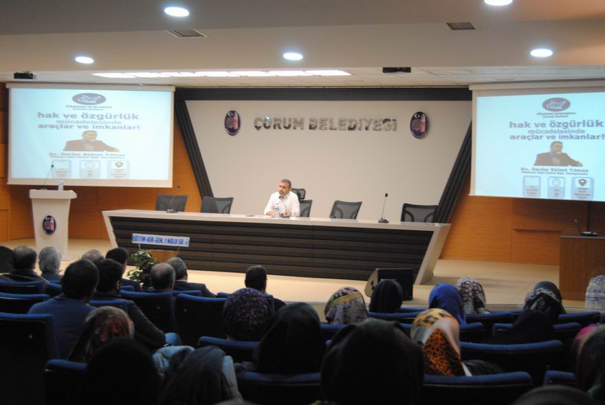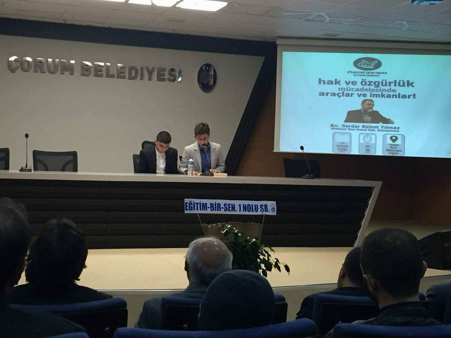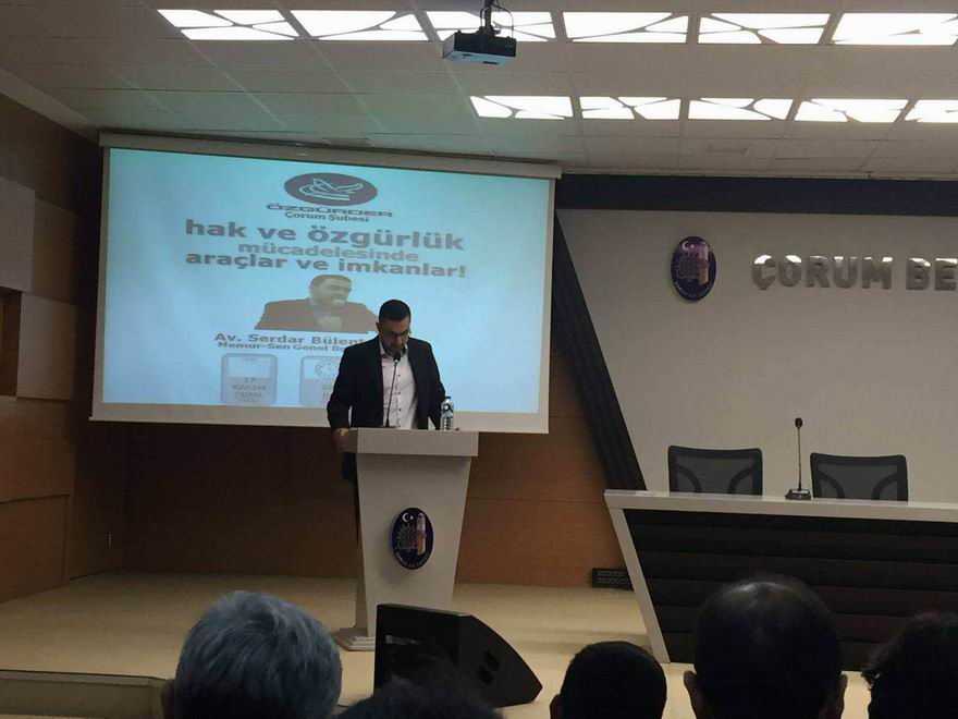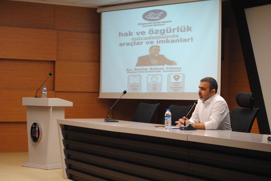 Özgür-Der Çorum Şubesi, Memur-Sen Genel Başkan Danışmanı Av. Serdar Bülent Yılmaz'ın konuşmacı olarak katıldığı “Hak ve Özgürlük Mücadelesinde Araçlar ve İmkânlar” konulu bir konferans düzenlendi.
