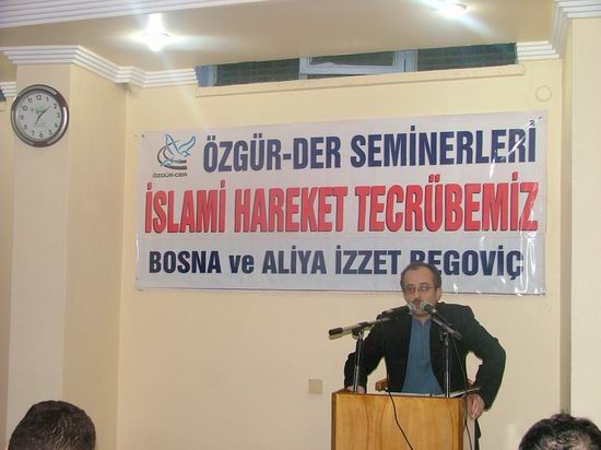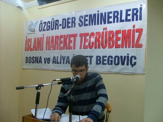 Özgür-Der Selahaddin Eyyubî Konferans Salonunda onuncusu gerçekleştirilen seminerde, Masum Yokuş, "Bosna ve Aliya İzzetbegoviç Tecrübemiz" hakkında tebliğ sunarken, Murat Koç ise sunumu müzakere etti.