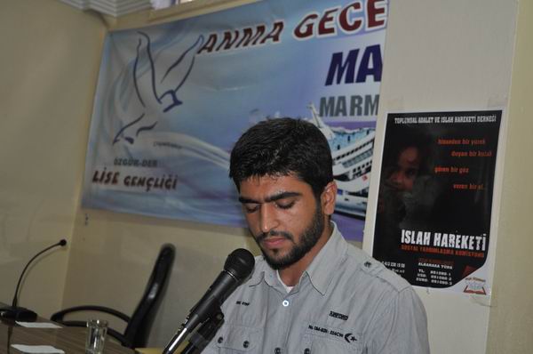 Özgür-Der Selahattin Eyyubi Konferans Salonunda yoğun katılımla gerçekleşen programı Osman Tuğrul sundu. Cemaatle kılınan namazın ardından Hasan Özer'in okuduğu Kuranı Kerimin Bilal Gökdemir'in mealini okumasıyla başlayan program, Mavi Marmara'nın yola çıkışı ile yaşanan katliamın anlatıldığı sinevizyon gösterimiyle devam etti.