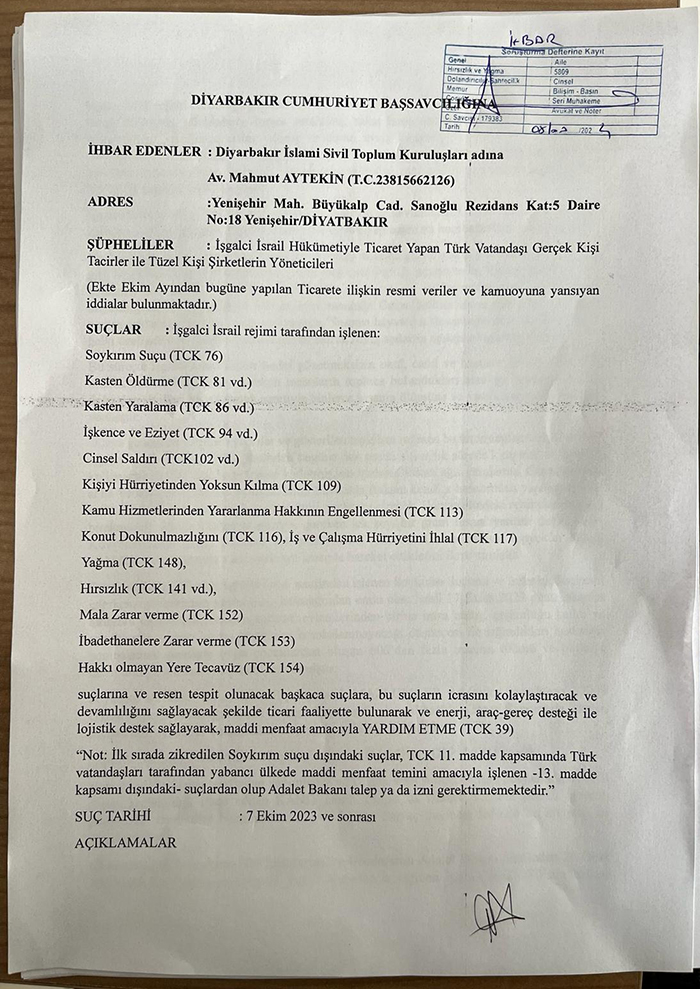 Diyarbakır İslami Sivil Toplum Kuruluşları olarak, İşgalci İsrail rejimin işlediği suçlar sebebiyle daha önce suç duyurusunda bulunmuştuk. Şimdi de bu katliamın yaşanmasına sözde ticaretleri ile destek veren, yardım eden ve destek olanlar hakkında Savcılığa ihbar da bulunuyoruz.