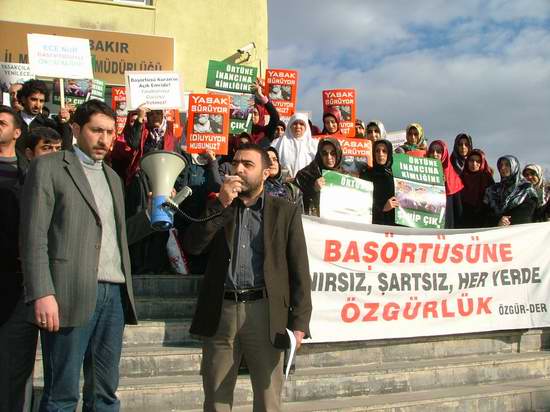 "Ece Nur Açılım Bekliyor", "Yasak Sürüyor (D)uyuyor musunuz?", "Başörtü Açılımı: Ya İkna Ya Sürgün", "Ece Nur Başörtüsüyle Okumalıdır", "Başörtüsü Kur'an'ın Açık Emridir, Yasaklamaya Kimsenin Gücü Yetmez", "Şiyar Be, Berxwe Bide, Azad Be (Uyan Diren Özgürleş", "Berxwedan Jiyane, Jiyan İslam e (Direniş Yaşamdır, Yaşam İslamdır)" dövizlerinin taşındığı eylemde ikinci konuşmacı olarak sözü Özgür-Der Diyarbakır Şube Başkanı Serdar Bülent Yılmaz aldı. Yılmaz, yasağı uygulayanların Ak Parti Hükümeti tarafından atanan kadrolar eliyle sürdürüldüğüne dikkat çekerek, "İktidar sorunu çözecek gerekli adımları atmadı. Cumhurbaşkanı değişti, YÖK kadrosu değişti, milli eğitim bürokrasisi değişti ama yasak sürüyor. Ak Partinin atadığı rektörler iş başındayken birçok üniversitede yasaklar hala devam ediyor, buna Dicle üniversitesi de dâhil. KPSS, KPDS, ALES ve benzeri sınavlara girişlerde de sorun devam ediyor. Bu alçaltıcı yasak lise ve ilköğretim okullarında ise çok daha katı" şeklinde konuştu.