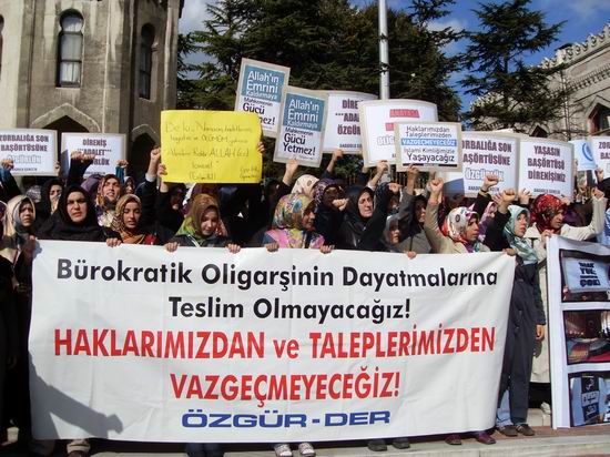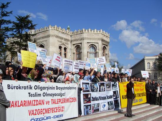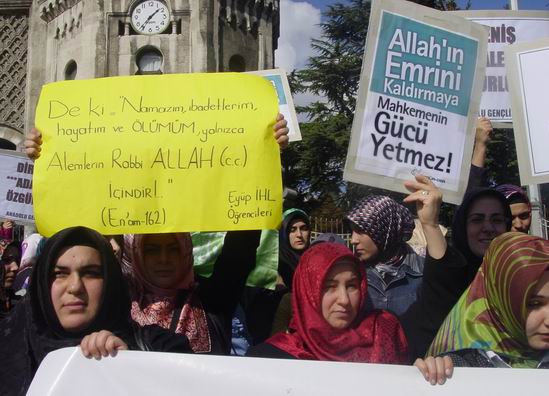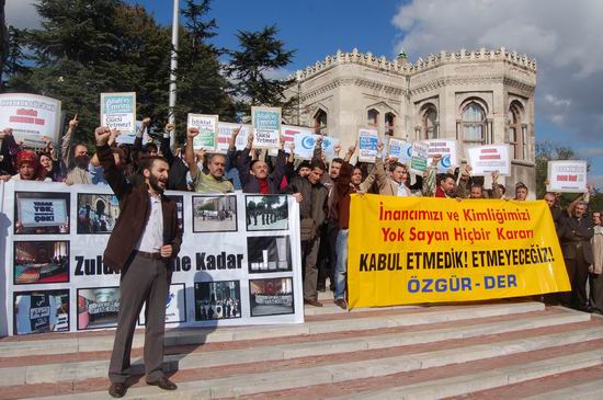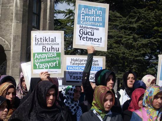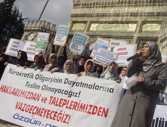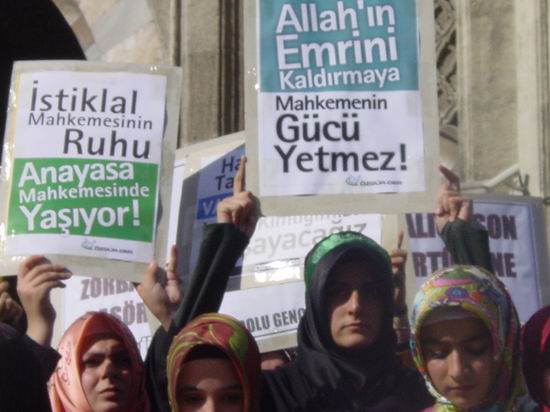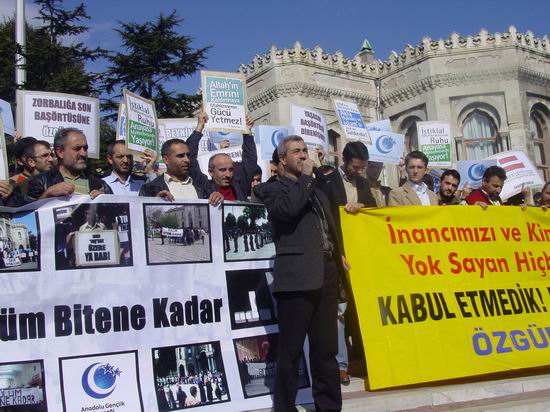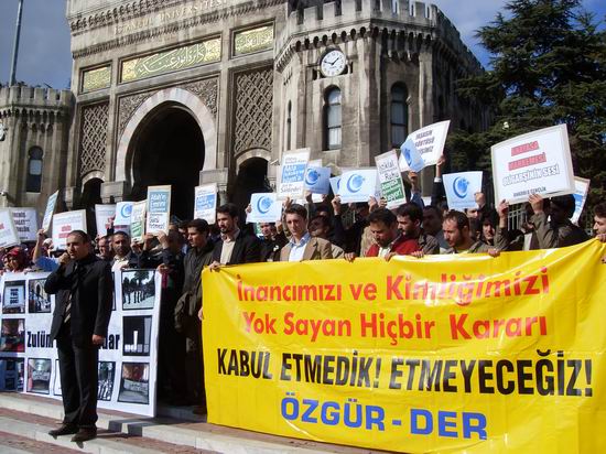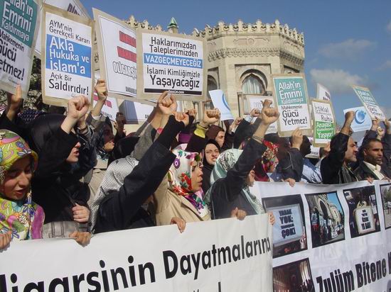 Özgür-Der, Anadolu Gençlik Derneği Üniversite Komisyonu, Adaleti Savunanlar Derneği (ASDER), Hukukçular Derneği, ve Eğitim Bir-Sen'in gerçekleştirdiği eylemde "İnancımızı ve Kimliğimizi Yok Sayan Hiçbir Kararı Kabul Etmedik; Etmeyeceğiz!" ,"Zulüm Bitene Kadar", "Bürokratik Oligarşinin Dayatmalarına Teslim Olmayacağız! Haklarımızdan ve Özgürlüklerimizden Vazgeçmeyeceğiz!" yazılı pankartlar açıldı. Ellerinde "Allah'ın Emrini Kaldırmaya Mahkemenin Gücü Yetmez", "Anayasa Mahkemesi Oligarşinin Sesi!", "İstiklal Mahkemelerinin Ruhu Anayasa Mahkemesi'nde Yaşıyor!", "AYM'nin Gerekçeli Kararı Akla, Hukuka ve İslam'a Açık Bir Saldırıdır!", "Beyniniz de Dar(be)", "Yaşasın Başörtüsü Mücadelemiz!" yazılı dövizler taşıyan topluluk Anayasa Mahkemesi kararının "yok" hükmünde olduğunu ilan etti.