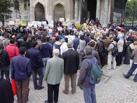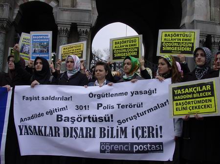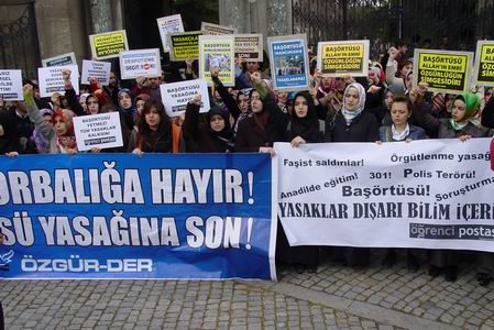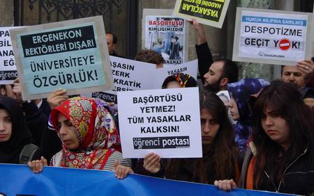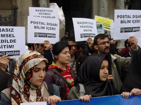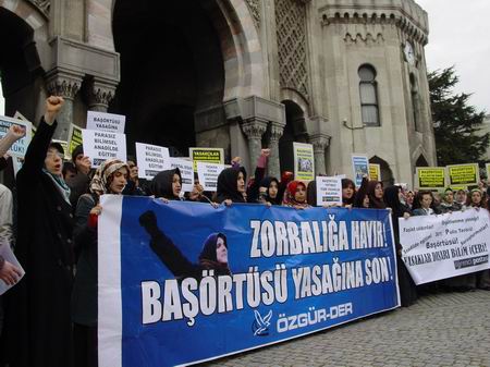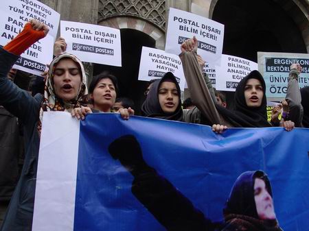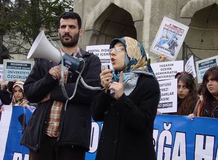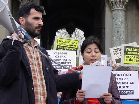 Başörtüsü yasağı ve yasakçı zorbalar bugün İstanbul Üniversitesi önünde farklı ideolojik kesimleri temsilen Müslüman ve sosyalist öğrenciler tarafından protesto edildi.
