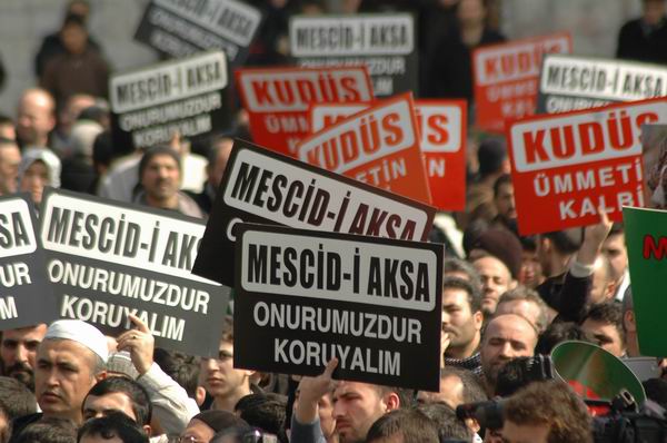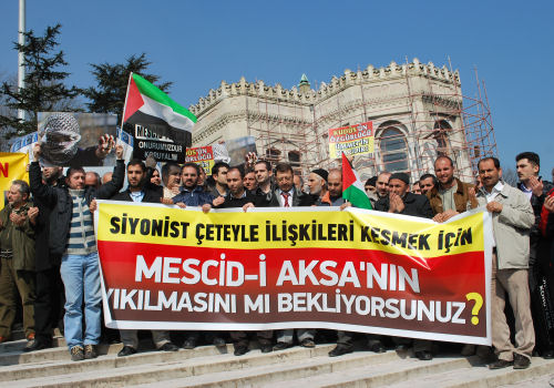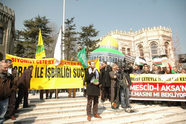 "Mescid-i Aksa Onurumuzdur!", "İsrail İle İşbirliği Suçtur!", "Siyonist Çeteyle İlişkileri Kesmek İçin Mescidi Aksa'nın Yıkılmasını mı Bekliyorsunuz?" vb. yazılı pankartların açıldığı eylemde çeşitli dövizler, Filistin direniş hareketlerinin flamaları ve tevhid bayrakları da taşındı.
