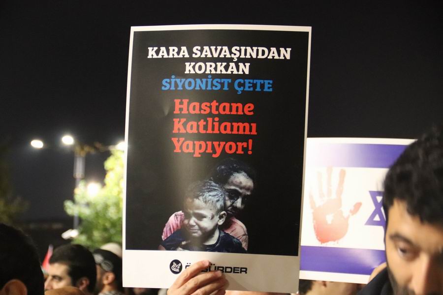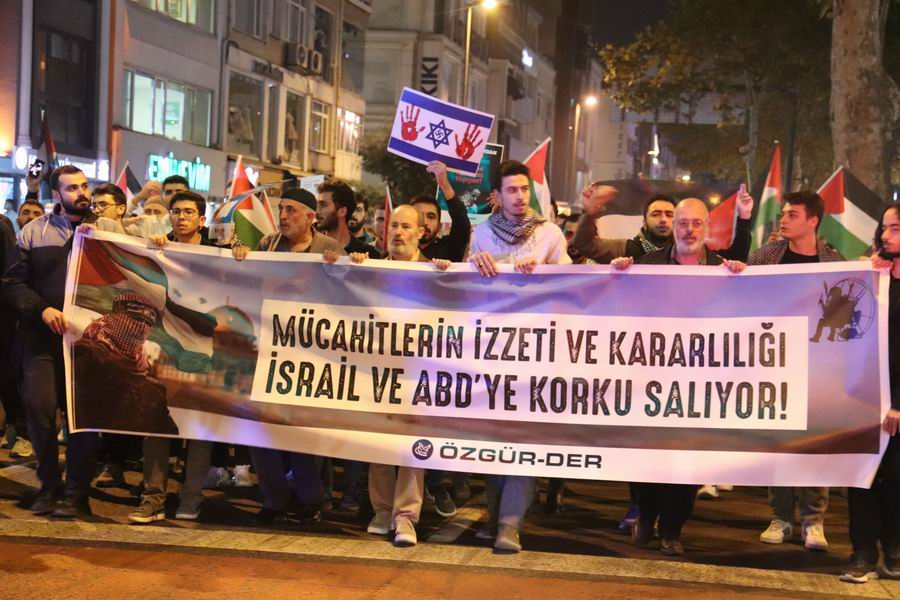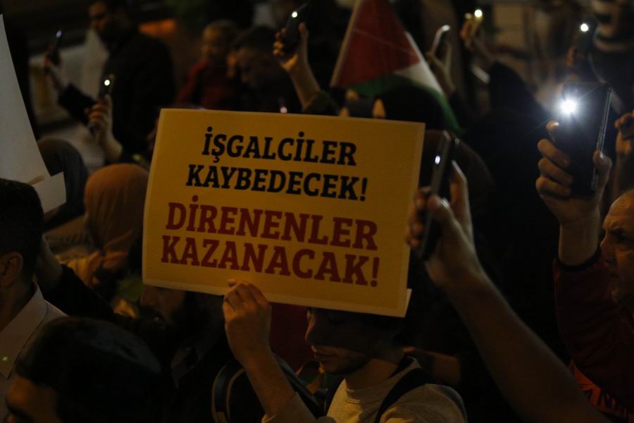 Direnen Filistinli Müslümanlara selam gönderilen eylemde “Katil İsrail Filistin’den Defol!”, “Yaşasın Ümmet Dayanışması!”, “Katil ABD Ortadoğu’dan Defol!”, “Siyonist Katiller Hesap Verecek!”, “Birruh Biddem Nefdiyke ya Aksa!” ve ”Mehmetçik Gazze’ye!” sloganları atıldı.