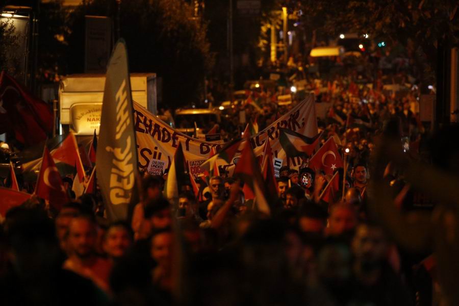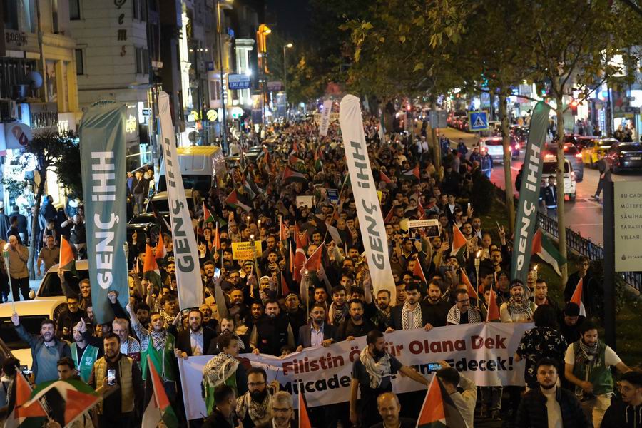 Genç İHH ve Özgür-Der’in çağrısıyla düzenlenen eylemde binlerde insan Fatih Camiinden Edirnekapı’ya yürürken işgal çetesinin katliamlarını lanetledi.