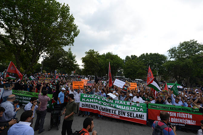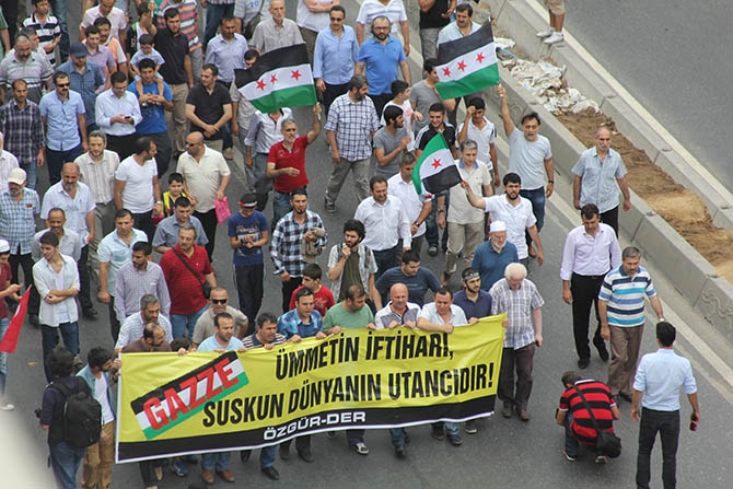 Murat Ayar’ın sunduğu eylemde “Şehidlerin Hesabı Sorulacak! Şehidlerin Kanı İsrail’i Boğacak!”, “Tarafsız Değil Tarafız! Zulmün ve İşgalin Karşısında, Adaletin ve Ümmetin Yanındayız!”, “Gazze Siyonist Katillere Mezar Olacak! Yaşasın Filistin İslami Direnişimiz!”, “Gazze, Ümmetin İftiharı, Suskun Dünyanın Utancıdır!”, “İki Devletli Çözüme Hayır, Filistin İçin Çözüm Tek Devlet!”, “Katil İsrail Filistin’den, Katil Esed Suriye’den, Katil Maliki Irak’tan, Defol!”, “Emperyalizm Yenilecek, İslami Direniş Kazanacak!”, “Müslüman Zulme Boyun Eğmez!” yazılı pankartlar açılırken “Katiller Vahşette Yarışıyor!”, “Gazze Seninleyiz!”, “Siyonizm Yenilecek, İslami Direniş Kazanacak!” yazılı dövizler ile Filistin, Özgür Suriye ve Tevhid bayrakları taşındı. Yoğun katılımın olduğu eylemde Özgür-Der Genel Başkanı Rıdvan Kaya, Köklü DeğişimEditörü Mahmut Kar ve Prof. Dr. Ahmet Ağırakça birer konuşma yaptı.