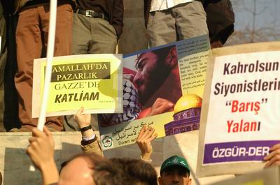Özgür-Der yönetim kurulu üyesi Kenan Alpay'ın yönettiği eylemde, ABD ve İsrail'in bölgeye yönelik politikaları tel'in edilerek, son dönemde yaşanan katliamlara sessiz kalınmaması, İsrail'le yapılan kirli antlaşmaların sona erdirilmesi, ümmet bilincinin diri tutulup Filistin'e uygulanan ambargoları ortadan kaldırmak için mücadele verilmesinin gerekliliği üzerinde duruldu. Medyanın kullandığı dilin de eleştirildiği eylemde, bunun Siyonizme hizmet eden bir dil olduğu vurgulanarak, Filistin'in meşru başbakanı Heniyye'den "eski başbakan", son Siyonist saldırılarda bir oğlunu daha şehid veren Mahmud ez-Zahar'dan "eski bakan" olarak söz edilmesinin bunun somut örneği olduğu dile getirildi.