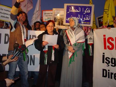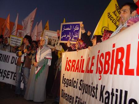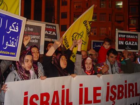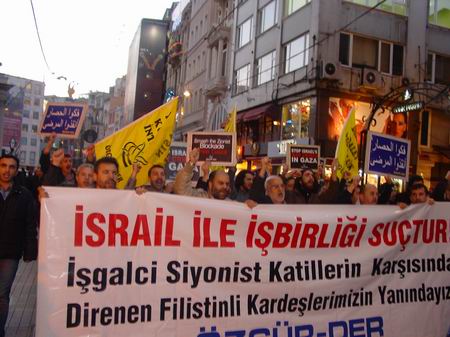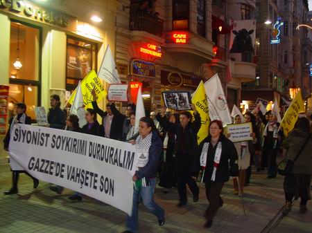 Filistin Halkıyla Dayanışma Derneği'nin çağrısıyla Galatasaray Lisesi'nin önünde toplanan FHDD, Özgür-Der, Mazlumder, ESP, Kaldıraç ve Halk Kültür Merkezleri üyeleri Gazze'de bütün bir dünyanın gözleri önünde Siyonist İsrail çetesi tarafından işlenen katliamları protesto ettiler. Galatasaray Lisesi önünde toplanan kalabalık bir grup ellerinde taşıdıkları "Siyonist Soykırımı Durduralım Gazze'de Vahşete Son!" ve "İsrail'le İşbirliği Suçtur! İsgalci Siyonist Katillerin Karşısında Direnen Filistinli Kardeşlerimizin Yanındayız" yazılı pankartlarla İstiklal Caddesi üzerinden Taksim Meydanı'na kadar yürüdüler. Sık sık "Katil İsrail Filistin'den Defol!", "Gazze Halkı Yalnız Değildir!", "Hamas'a Selam, Direnişe Devam!" vb sloganlar atan topluluk Taksim Meydanı'na ulaşınca basın açıklaması yaptı.