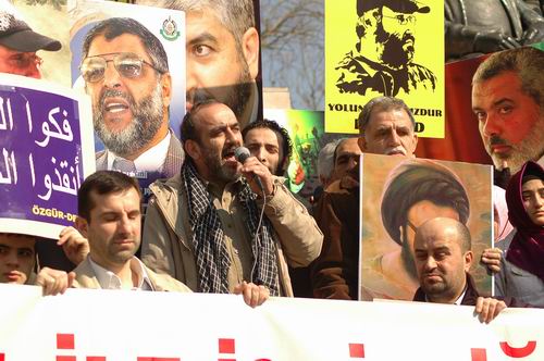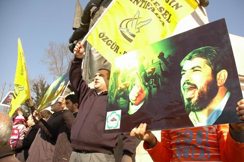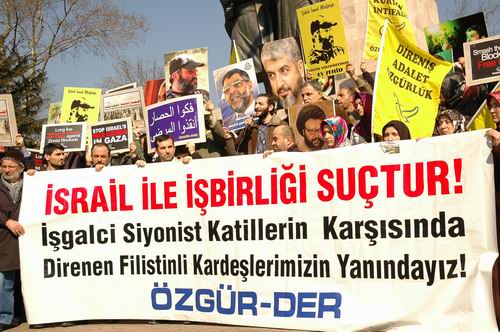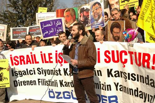 "İsrail ile İşbirliği Suçtur! İşgalci Siyonist Katillerin Karşısında; Direnen Filistinli Kardeşlerimizin Yanındayız!" yazılı bir pankartın açıldığı eylemde Gazze ambargosunu protesto içerikli İngilizce ve Arapça dövizler taşındı. Filistinli şehit ve direniş önderleri Şeyh Ahmed Yasin, Abbas Musavi, Abdulaziz Rantisi, İsmail Heniyye, Halid Meşal ve son olarak Şam'da şehit edilen Hizbullah komutanı İmad Muğniye'nin posterlerinin taşındığı eyleme Kudüs-Der ve Kardelen-Der de destek verdi.
