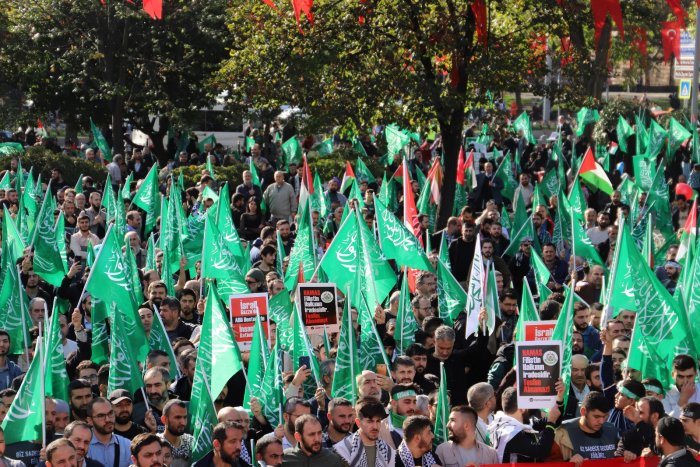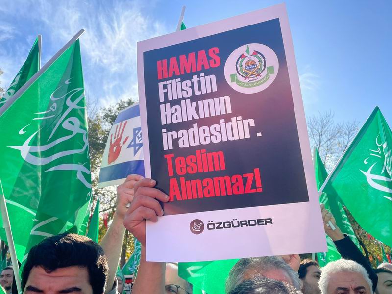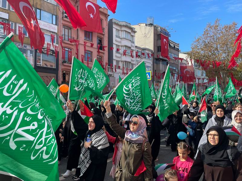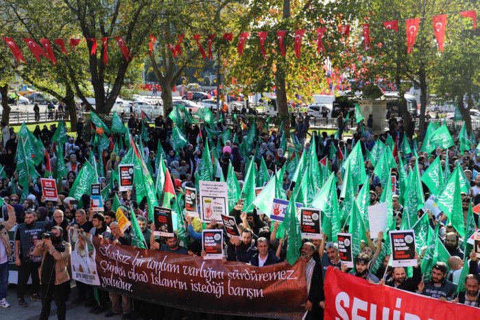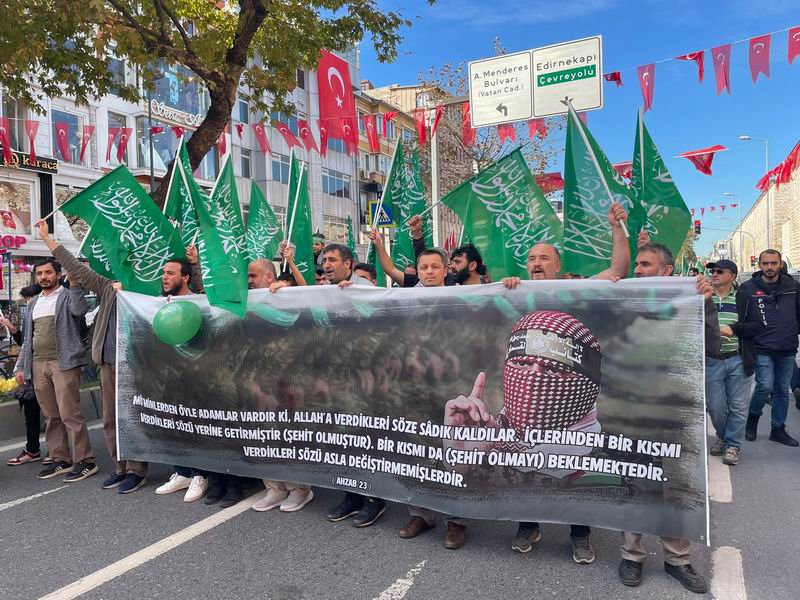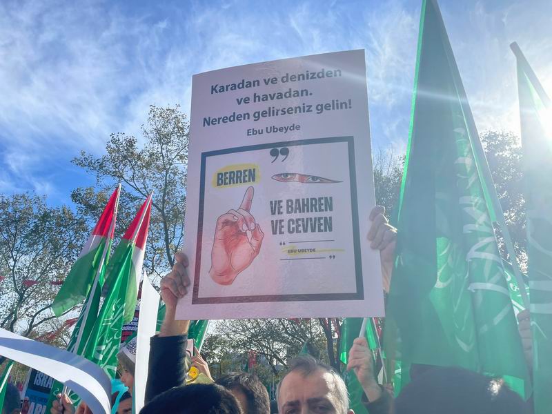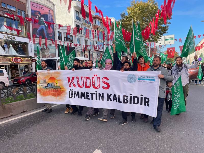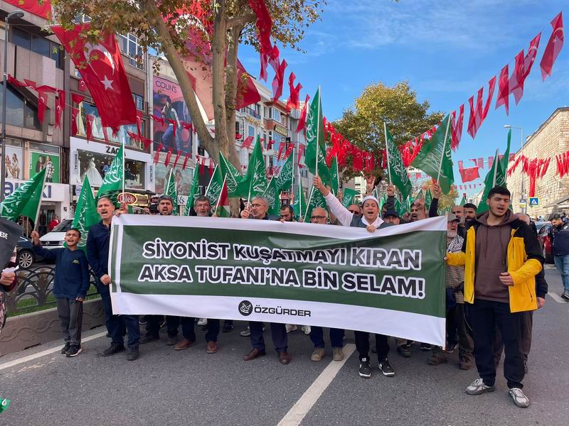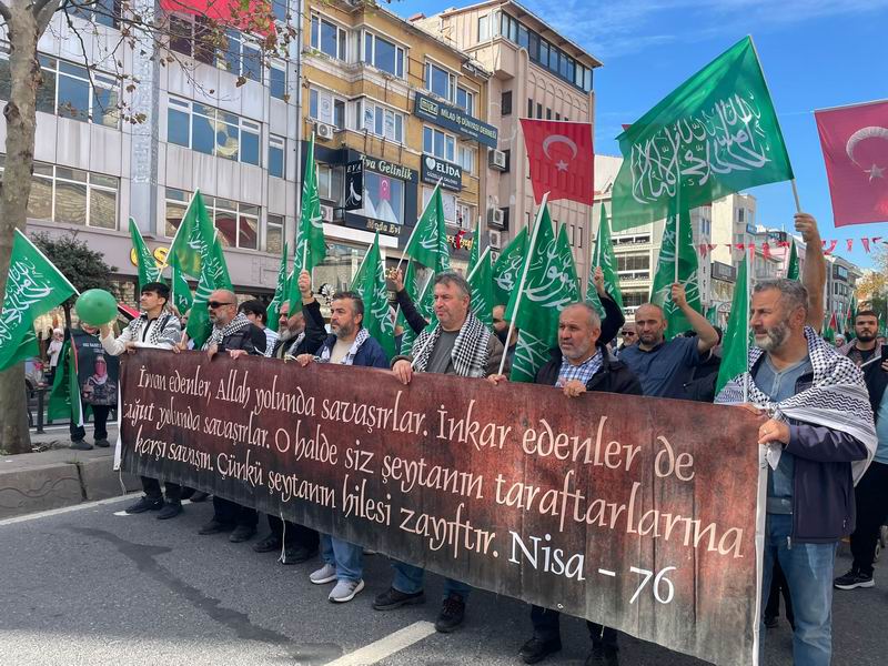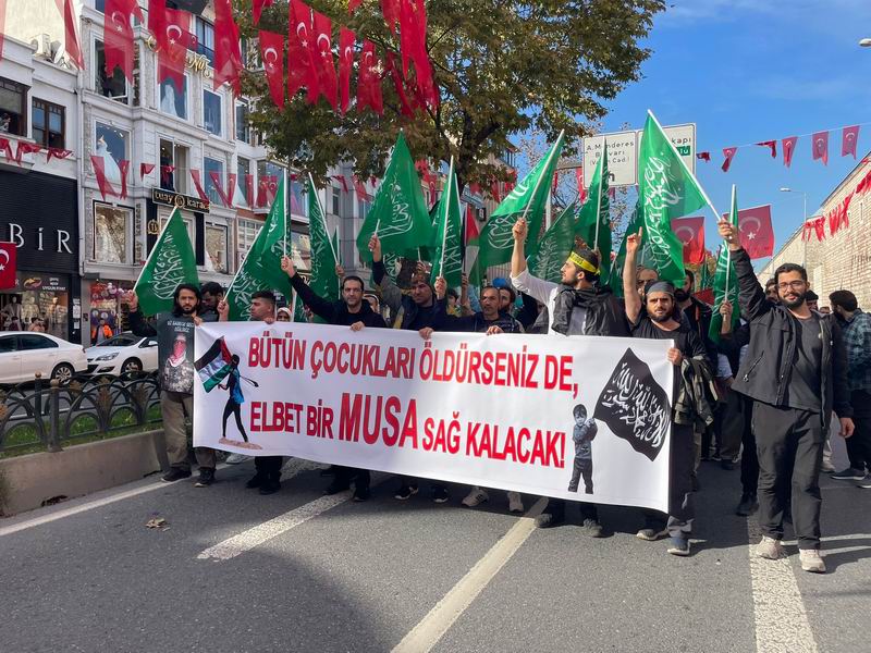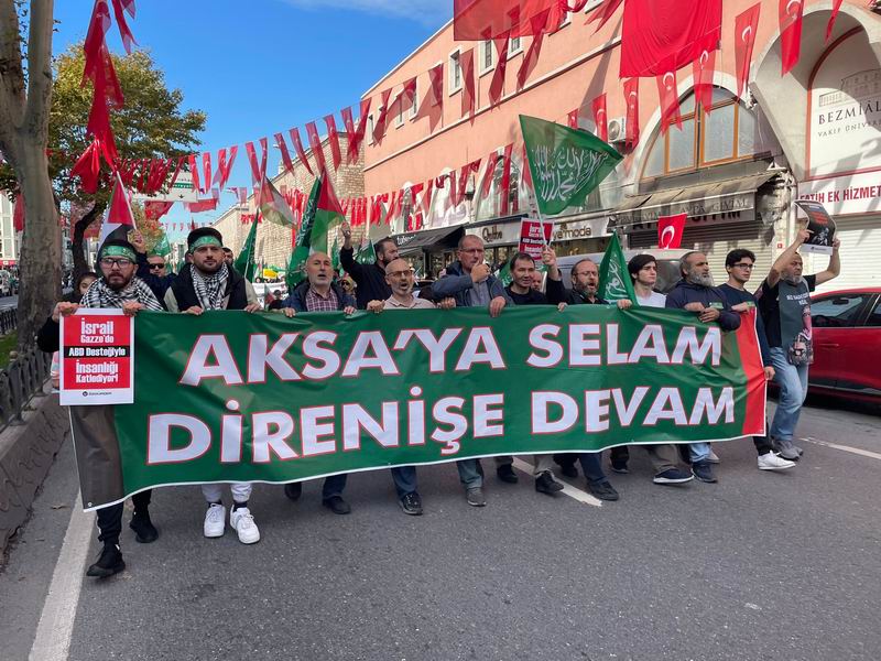 Yürüyüş ve eylem sırasında “Yaşasın Küresel İntifada!”, “İsrail’le İlişki Meşru Değildir!”, “İstanbul’dan Gazze’ye Direnişe Bin Selam!”, “Müslüman Zillete Boyun Eğmez!”, “Aksa Tufanı İsrail’i Boğacak!” sloganları atıldı ve tekbirler getirildi.