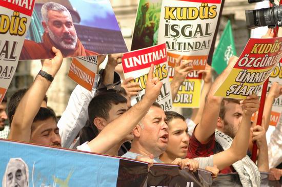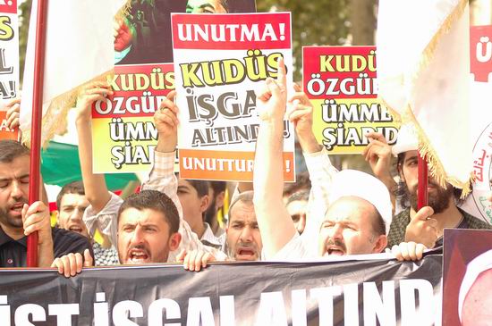 "Kudüs'ün Özgürlüğü Ümmetin Şiarıdır!", "Unutma! Kudüs İşgal Altında! Unutturma!", "Aksa Canımız, Feda Olsun Kanımız!" vb. dövizlerin taşındığı etkinlikde katılımcılar da Kudüs'e olan ahitlerini coşkulu sloganlarla dile getirdiler. Etkinlik boyunca tekbirler getiren katılımcılar sık sık şu sloganları attılar: "Kahrolsun İsrail, Kahrolsun Amerika!", "Katil İsrail Filistin'den Defol!", "Katil ABD Ortadoğu'dan Defol'", "Direnen Filistin Kazanacak!", "Her Yer Kudüs, Hepimiz Kudüslüyüz!", "Şehitlerin Yolunu Sürdüreceğiz!", "Yaşasın Küresel İntifada!", "Emperyalizm Yenilecek İslami Direniş Kazanacak!" vd.