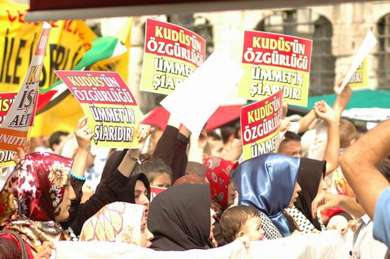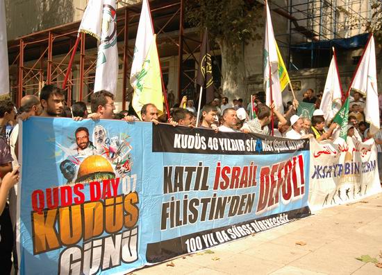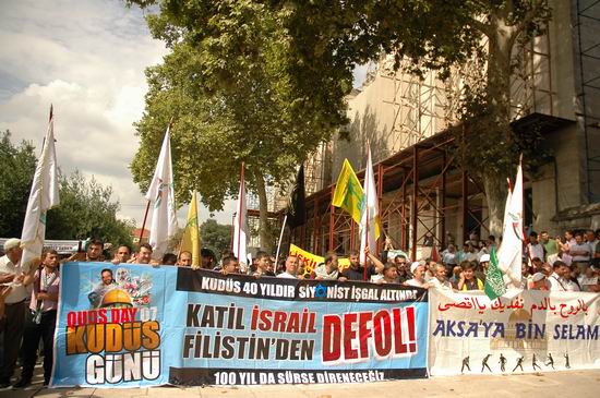 Cuma namazının ardından en ön safta açılan "Kudüs Günü İslam'ın Diriliş Günüdür!"," İşgal 100 Yıl da Sürse Direneceğiz!", "Aksa'ya Bin Selam!", "Siyonist Elçilik Kapatılsın!" ve "Siyonist Çete İle İlişkiler Kesilsin: İsrail İle İşbirliği Suçtur!" yazılı pankartlar eşliğinde gerçekleştirilen etkinlikte ABD ve İsrail ile birlikte işbirlikçi politikalar da protesto edildi.