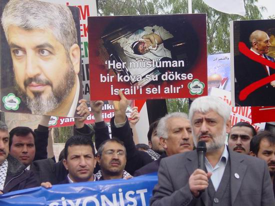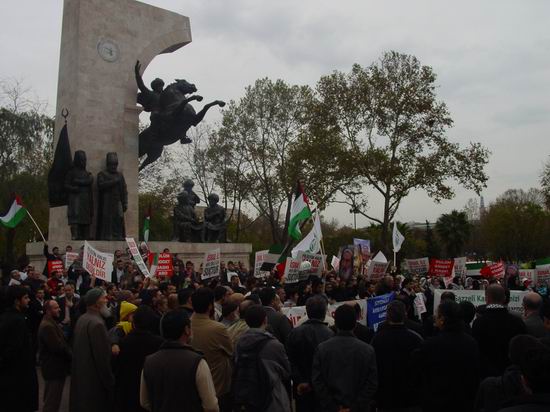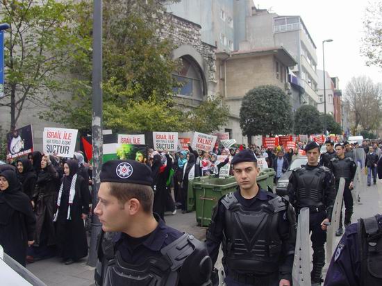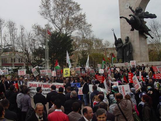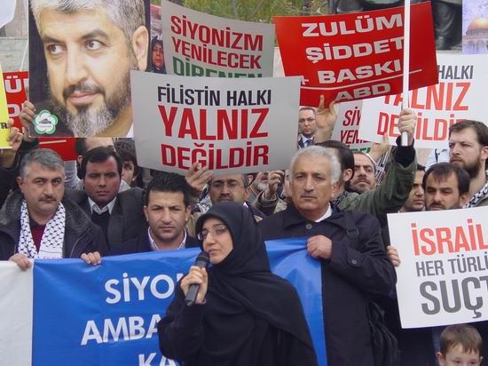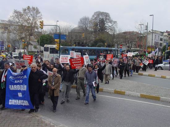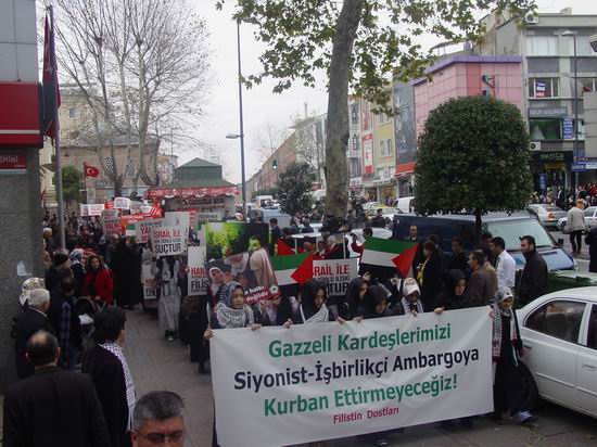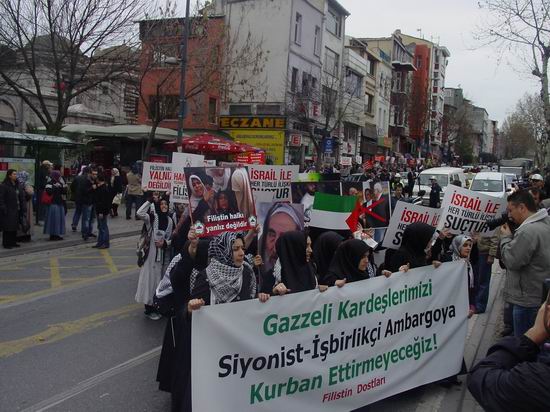 Çeşitli İslami kuruluş temsilcilerinin de söz aldığı eylemde kalabalık bir Müslüman kitlenin katılımıyla Fatih Postanesi'nden Saraçhane Parkı'na doğru bir protesto yürüyüşü gerçekleştirildi. Yürüyüş sırasında "Gazzeli Kardeşlerimizi Siyonist-İşbirlikçi Ambargoya Kurban Etmeyeceğiz!", "Siyonist Ambargoya Karşı Kardeşlik ve Dayanışma!", "İsrail'le İşbirliği Suçtur!" ve "İşgalci Siyonist Kafirlerin Karşısında - Filistinli Kardeşlerimizin Yanındayız!" pankartları açan topluluk eylem boyunca sık sık tekbir getirdi ve şu sloganları attı: "Mazlumlar Tutsak, İşgal Altında; Yaşasın Küresel İntifada!", "Hizbullah'a, Hamas'a, Direnişe Bin Selam!", "Filistin-Gazze Halkı Yalnız Değildir!", "İslami Hareket Engellenemez!", "Siyonist Elçilik Kapatılsın", "Birruh Biddem Nefdike Ya Aksa!", "Katil Amerika Ortadoğu'dan Defol!", "Kahrolsun İşbirlikçi Zalimler!", "İslami Direniş Siyonizmi Boğacak!", "İşbirlikçi HAinler Hesap Verecek!"