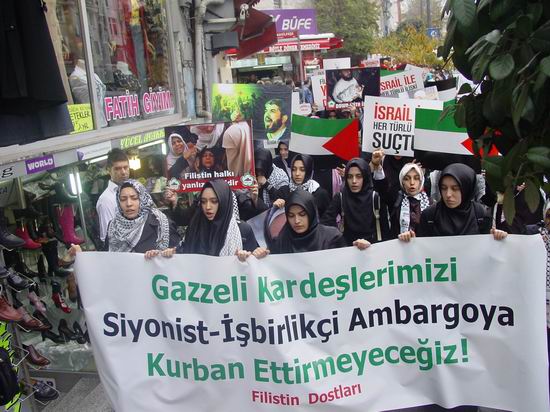 Filistin Dostları'nın çağrısıyla kuşatma altında olan Gazze'ye destek olmak amacıyla Fatih'te bir araya gelen Müslümanlar kortej halinde Saraçhane Parkı'na kadar yürüyerek İsrail'i ve başta Mısır olmak üzere kuşatmaya seyirci kalan işbirlikçileri protesto