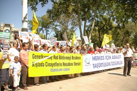 Ramazan ayı boyunca başörtüsüne özgürlük eylemlerini sürdüren Özgür-Der, bu haftaki eylemde Genelkurmay’dan kışladaki cinayetlerin hesabını vermesini istedi. Genelkurmay’ın had bildirmeyi bırakmasının dillendirildiği eyleme yoğun bir katılım oldu.