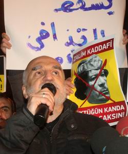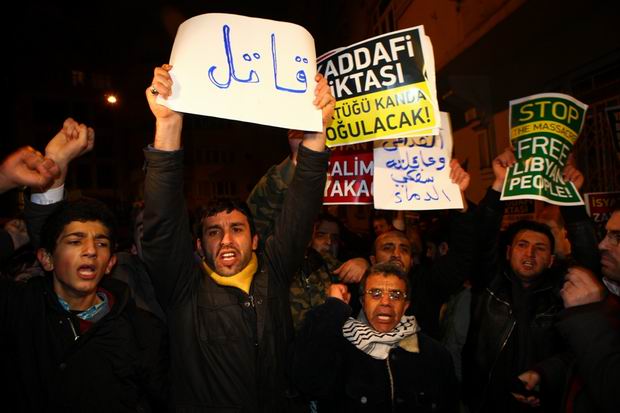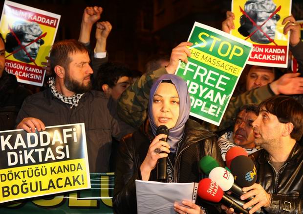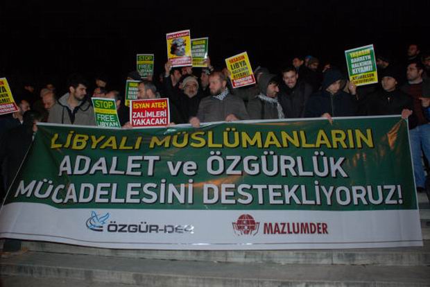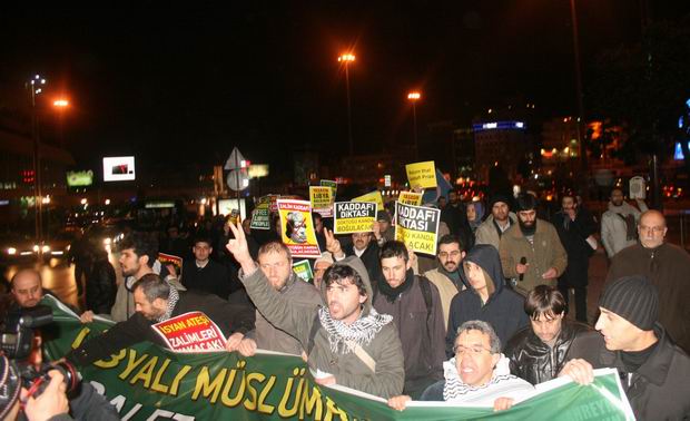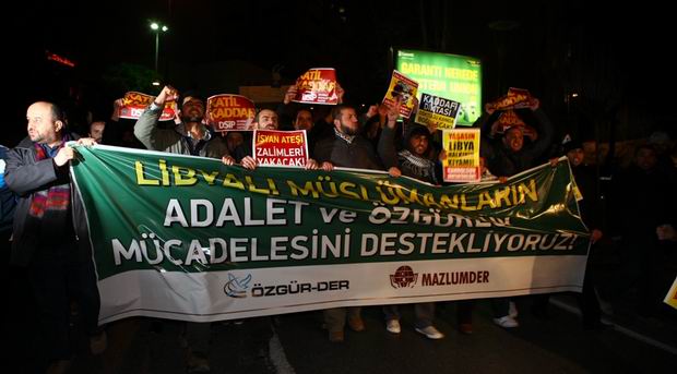 Tunus ve Mısır halklarının, diktatörleri devirmesinden sonra Ortadoğu'da birçok yerde isyan ateşi alevleniyor. Özellikle Libya'da göstericilere karşı Kaddafi yönetiminin katliam boyutunda şiddet uygulaması birçok tepkiyi beraberinde doğurdu. Libya'da Kaddafi diktasının gerçekleştirdiği katliamı protesto etmek, Libya ve Bahreyn halklarının kıyamını selamlamak için Özgür-Der, Mazlumder ve İHH'nın çağrısıyla bu akşam 19.00'da Taksim Meydanı'nda toplanan Müslümanlar, buradan "Libyalı Müslümanların Adalet ve Özgürlük Mücadelesini Destekliyoruz!" yazılı pankart açarak Gümüşsuyu'nda bulunan Libya Konsolosluğu önüne kadar yürüdüler.