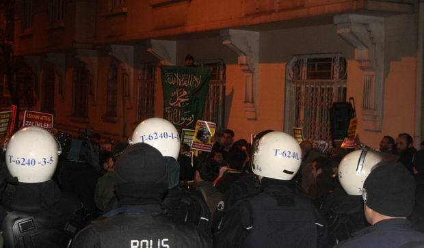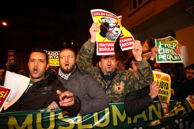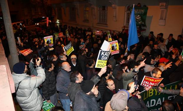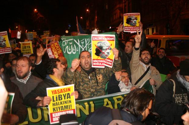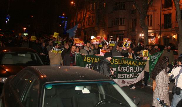 "Yaşasın Libya Halkının Kıyamı, Kahrolsun Diktatörlük!", "Yaşasın Bahreyn Kıyamı Kahrolsun Diktatörlük!", "Kaddafi Diktası Döktüğü Kanda Boğulacak!", "Stop The Massacre Free Lıbyan People!", "İsyan Ateşi Zalimleri Yakacak!", "Zalim Kaddafi Döktüğün Kanda Boğulacaksın!" yazılı dövizler taşıyan kalabalık sloganlar ve tekbirlerle yolu trafiğe kapatarak Libya Konsolosluğu önünde polisin kurduğu barikata kadar yürüdü.