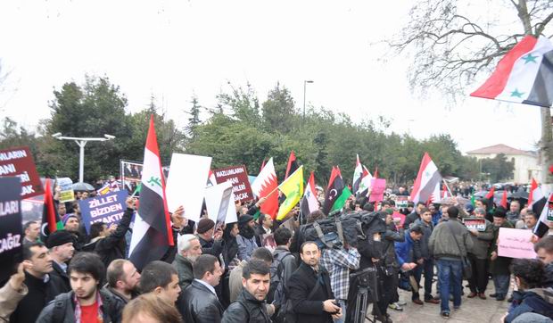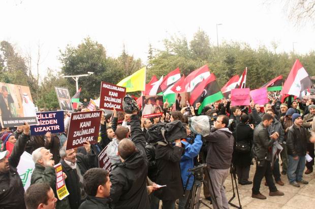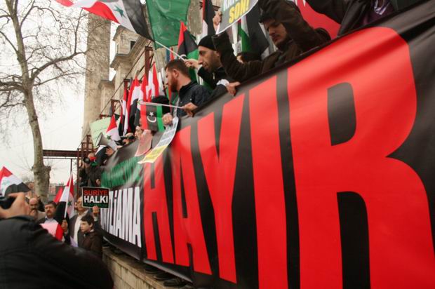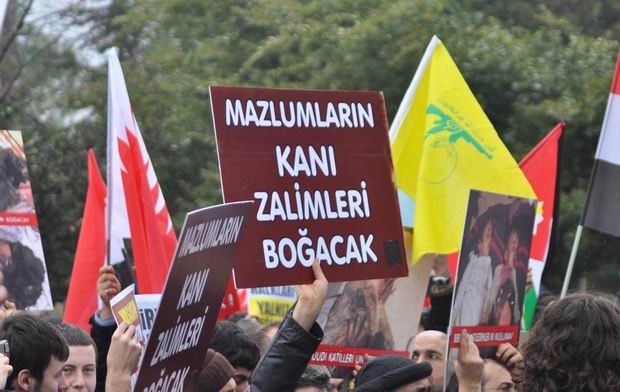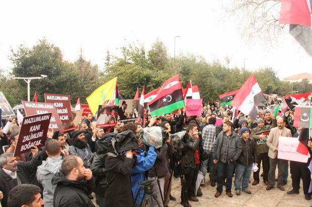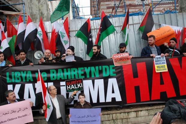 "Libya ve Bahreyn'de Katliama Hayır!" yazılı bir pankartın açıldığı eylemde "Libya ve Bahreyn Hakları Yalnız Değildir!", "Yaşasın Bahreyn Halkının Kıyamı Kahrolsun Diktatörlük!", "İntifada Sürüyor!", "Suriye Halkı Yalnız Değildir!" vb. yazılı dözvizler taşındı.