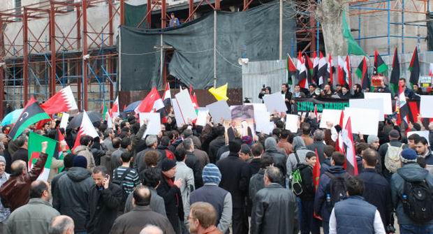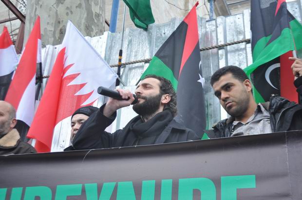 Özgür-Der, İHH, Fatih Akıncılar Derneği, Mazlumder, AKDAV, İnsan ve Medeniyet Hareketi, Araştırma Kültür Vakfı, Akabe Vakfı, Medeniyet Derneği, Dünya Yayınları ve Hikmet Vakfı gibi İslami kuruluşların çağrısıyla yapılan eylemin sunumunu yapan Murat Özer, Ortadoğu'da yaşanan direniş dalgasına dikkat çektikten sonra sözü Libya'ya getirdi. Kaddafi'nin 42 yıllık iktidarı boyunca ABD karşıtlığı ve dünyadaki İslami hareketlere yaptığı yardımlarla övündüğünü aktaran Özer, gerçekte Batılılara seslenip "Ülkemde İslamcı militanlara karşı savaşıyorum." diyerek Müslüman toplumlara dadanmış diğer diktatörler gibi nasıl bir İsrail dostu olduğunu ortaya koyduğunu ifade etti.