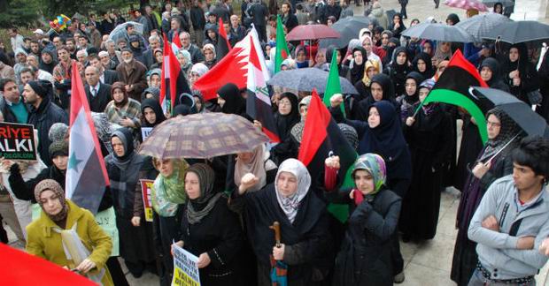 İslami kuruluşlar bugün Cuma namazı sonrasında Fatih Camii avlusunda Libya ve Bahreyn'de akan kanın durması çağrısında bulunup direnen Ortadoğu halklarını selamladılar.