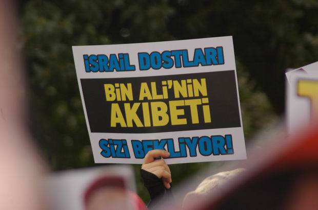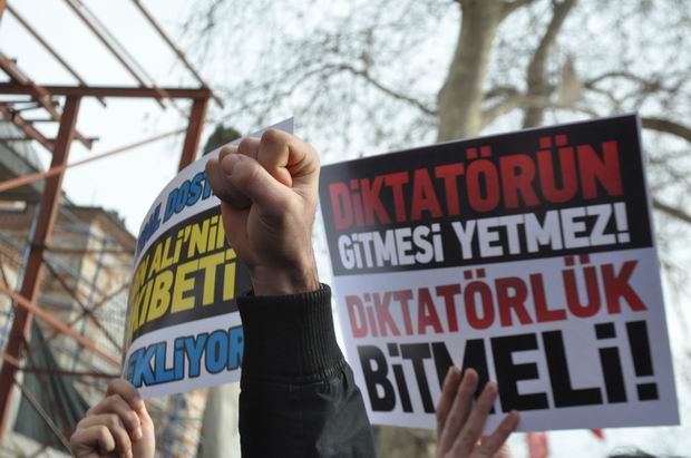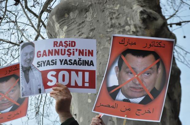"Yaşasın Mısır İntifadası! Kahrolsun Mübarek Diktası!" ve "Diktatörlük ve Zulme Karşı Mısır Halkının Direnişinin Yanındayız!", "Tunuslu Kardeşlerimizin Hak ve Özgürlük Mücadelesini Selamlıyoruz!" pankartlarının açıldığı eylemde Siyonist İsrail'in Filistin katliamlarını teşhir edici ve Tunus intifadasıyla dayanışmayı ifade eden dövizlerin yanı sıra Mısır konulu "Mısır Halkı Yalnız Değildir!", "Hak ve Özgürlük Mücadelesini Destekliyoruz!", "Diktatör Mübarek, Mısır'dan Defol!", "İsrail Dostları Bin Ali'nin Akıbeti Sizi Bekliyor!" yazılı dövizleri taşındı.