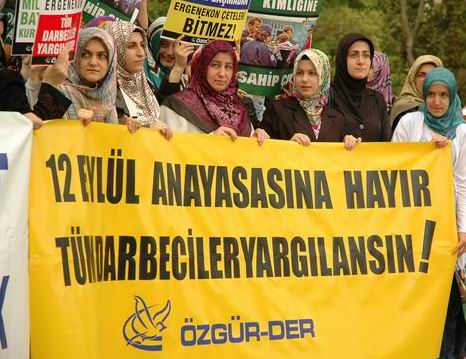 Özgür-Der mensupları 12 Eylül’ün yıldönümünde bütün darbelerin lanetlenmesi ve tüm darbecilerin yargılanması talebini dillendiren bir protesto eylemi düzenlediler. Eylemde başörtüsüne özgürlük mücadelesinin de sürdürüleceği ifade edildi.