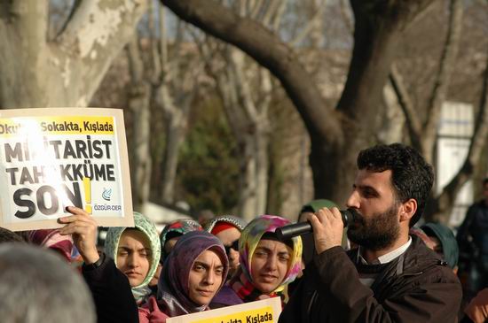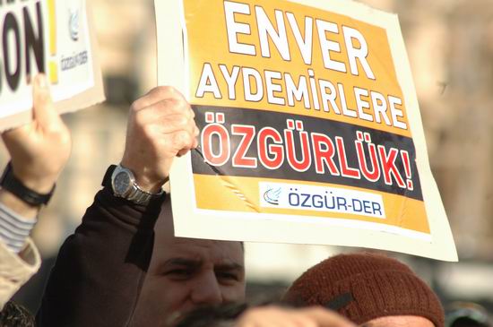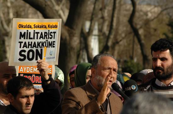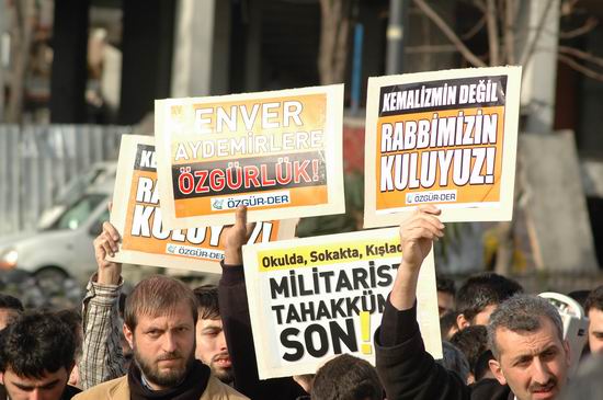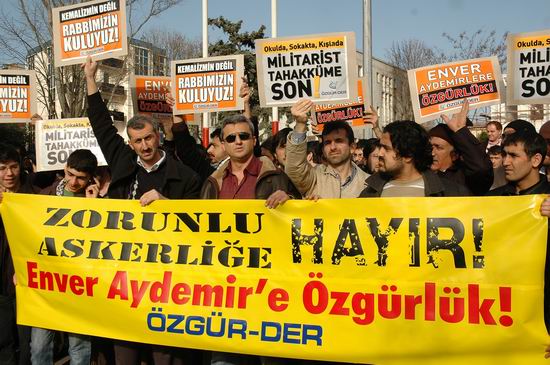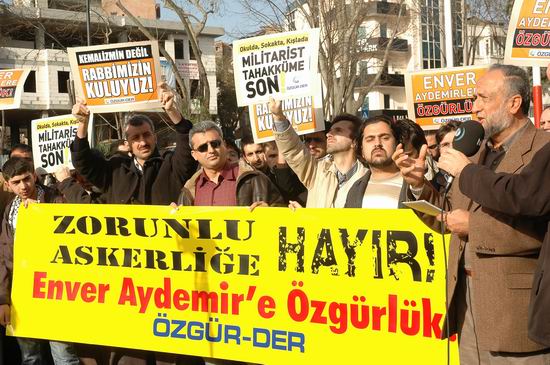 Özgür-Der'in çağrısıyla bugün 13.00'te Fatih Saraçhane Parkı'nda zorunlu askerliği ve Enver Aydemir'in tutuklanması ve işkence görmesini protesto eylemi yapıldı. Özgür-Der mensuplarıyla birlikte konuya duyarlı insanların da katılım gösterdiği eylemde İslami kimliğe, halkın inançlarına ve değerlerine savaş açan bir ordunun; zorunlu askerliği dayatmasının zulüm olduğuna dikkat çekildi. İslami kimliğinden ötürü askerlik yapmayı kabul etmeyen, üniforma giymeyi ve silah altına alınmayı reddeden ve bu tercihinden ötürü sistematik işkenceye maruz kalan, başka pek çok vicdani retçi gibi zorunlu askerlik dayatmasının, zulmünün mağduru Enver Aydemir'in yalnız olmadığının vurgulandığı eylemde Kemalist düzeni Kemalistlerin koruması gerektiği ifade edildi.