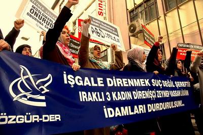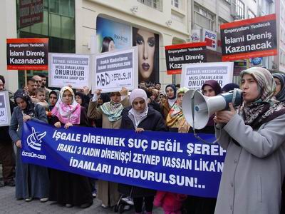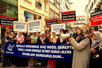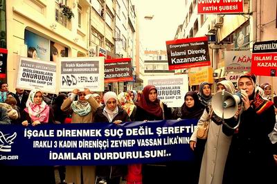 Bugün Fatih Postanesi önünde toplanan Özgür-Der mensupları ve gönüldaşları 3 Mart'ta idamları infaz edilecek olan Zeyneb, Vassan, Liqa ve direnen tüm kadınların Müslümanların onuru olduğunu ifade ettiler. "İşgale Karşı Direnmek Suç Değil, Şereftir! Iraklı 3 Kadın Direnişçi Zeynep, Vassan ve Liqa'nın İdamları Durdurulsun!" yazılı bir pankart açan grup ellerinde de "Zeynep, Vassan, Lika: Müslümanların Onurudur! Onuruna Sahip Çık!", "Iraklı Kadınların İdamı Durdurulsun; ABD Defolsun!", "Emperyalizm Yenilecek, İslami Direniş Kazanacak!" yazılı dövizler taşıdılar.
