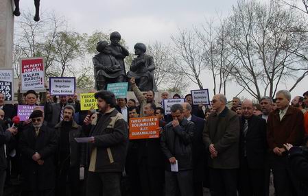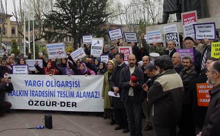 Anayasa Mahkemesi'nin iddianameyi kabul etmesinin halkın iradesine ipotek koymak anlamına geldiğini belirten konuşmacılar; bu ülkede darbeci ve çeteci güçlerin dayattığı "hukuk"un egemen olduğu ve halkın iradesinin üzerinde sürekli olarak demoklesin kılıcının sallandığını ifade ettiler. Anayasa Mahkemesi'nin değil; bizzat Meclis'in Anayasa Mahkemesi'ni kapatma yetkisi olduğunu belirten konuşmacılar; hükümetin askeri, sivil bürokrasisi, yargısı, medyası, çeteleriyle tüm darbeci güçlerin üstüne gitmesi gerektiğini vurguladılar.