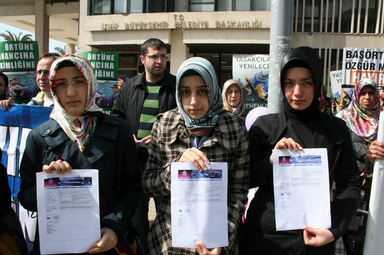 İzmir Büyük Şehir Belediyesi’nin indirimli ulaşım kartlarında başörtülü fotoğraf veren öğrencilerin başvurularının reddedilmesi İzmirli Müslümanlar tarafından protesto edildi.