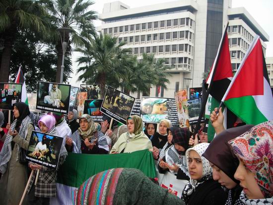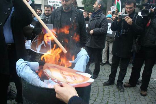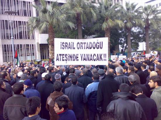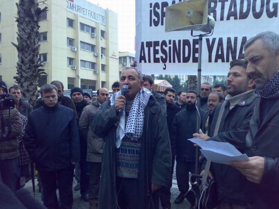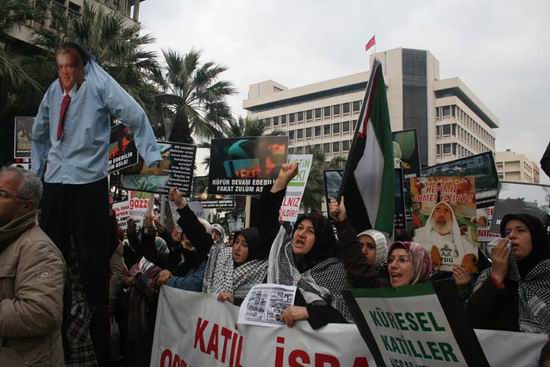 ''Kahrolsun İsrail, Kahrolsun Amerika!'',İsrail ile Anlaşmalar İptal Edilsin'' Siyonist Elçilik Kapatılsın!", "İsrail, Döktüğün Kanda Boğulacaksın!'',,''Müslüman uyuma kardeşlerine sahip çık''sloganlarının atıldığı eylemde "Katil İsrail Ortadoğu'dan Defol" ve "İsrail Ortadoğu ateşinde yanacak" pankartları açıldı.Eylem alanına getirilen varildeki ateşe Bush,Rice,Livni,Olmert ve Şaron fotoğrafları ile ABD ve İsrail bayrakları atıldı.
