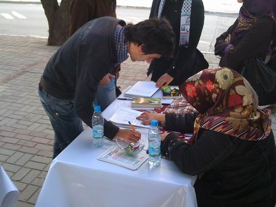 Ziyaretçi çocuklara 'Hepimiz Filistinliyiz' yazılı balonların verildiği sergide, Türkiye Cumhuriyeti Hükümeti'ne gönderilmek üzere bir metin de imzaya açıldı. Hükümetten İsrail'in uyguladığı vahşeti soykırım olarak tanımasının; mevcut tüm askerî anlaşmaları iptal etmesinin; her sene Konya'da yapılan hava ve Akdeniz'de gerçekleştirilen deniz tatbikatlarına son verilmesinin; Siyonist elçiliğin kapatılıp, Tel-Aviv'deki büyükelçinin geri çekilmesinin istendiği metni ilk üç günde 1088 kişi imzaladı.